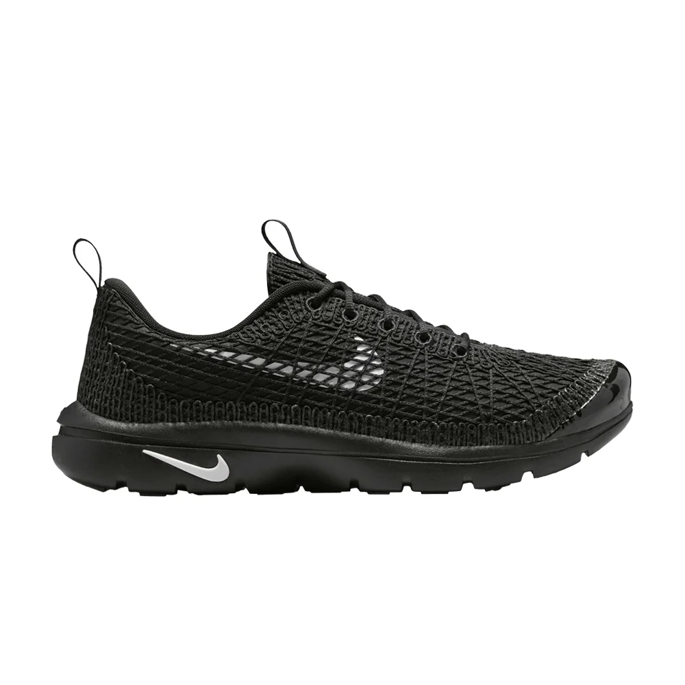 Comme des Garcons Homme Plus x Nike Air Rejuven8 'Black' revives an archival recovery sneaker originally released in 2008. Flywire cables form a tonal lattice-like structure atop the black textile upper, reinforced with a glossy TPU toe cap and accented with white Swoosh branding. Webbing pull tabs are affixed to the tongue and heel, the latter marked with CDG Homme Plus branding. Underfoot, the outsole features deep flex grooves that promote the natural motion of the foot. UPPER MATERIAL Textile