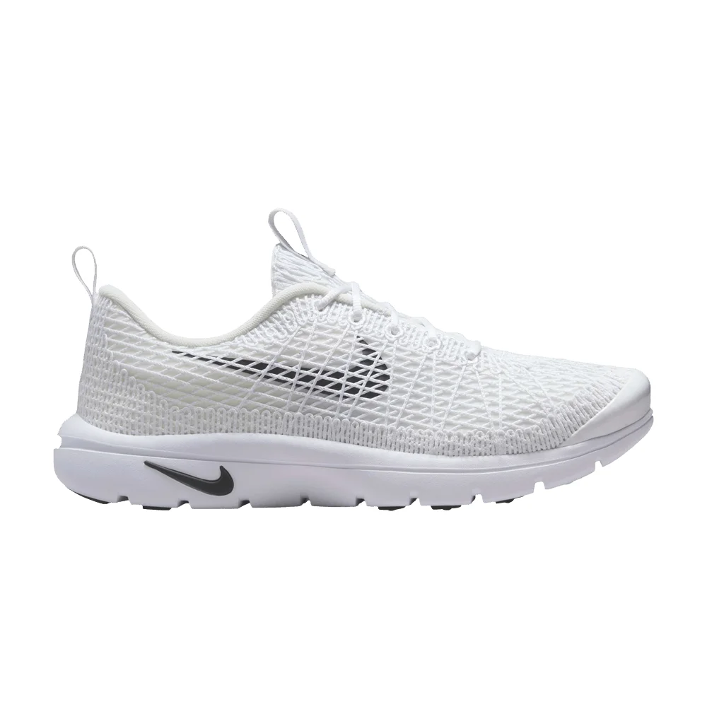 The Comme des Garcons Homme Plus x Nike Air Rejuven8 'White' made its debut at Paris Fashion Week during the Japanese brand's Fall/Winter 2025 runway show. The archival sneaker makes use of a white textile upper, overlaid with crisscrossing Flywire cables that form a lattice-like structure. A black Swoosh adorns the side panel, while CDG Homme Plus branding graces a webbing pull tab at the heel. A lightweight foam midsole is supported by a grippy rubber outsole with flex grooves for a smooth, natural stride. UPPER MATERIAL Textile