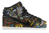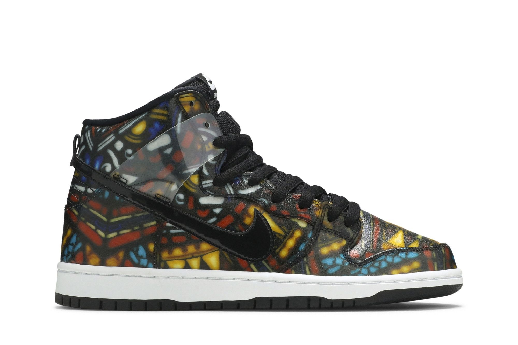 The Nike Concepts x SB Dunk High 'Stained Glass' features a church-inspired stained glass window graphic on the upper with a black Swoosh, white midsole, and black outsole. It also comes with Concepts branding on the tongue and a special edition stained glass box. Released exclusively at Concepts stores in July 2015, the ‘Grail Pack’ also included the Nike Dunk Low Pro SB 'Holy Grail' and the Nike SB Stefan Janoski Max ‘Mosaic.’