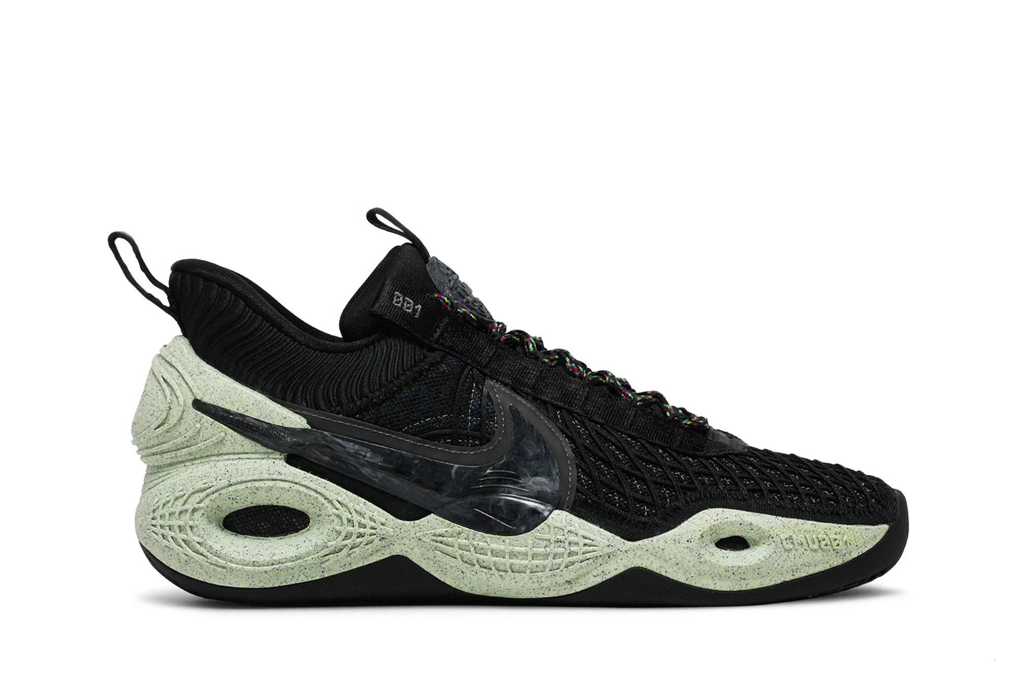 The Nike Cosmic Unity ‘Green Glow’ represents the debut colorway of the Swoosh’s first performance shoe to feature at least 25% recycled content by weight. Released under the auspices of the brand’s Move to Zero initiative, the hoops shoe makes use of a layered textile upper constructed from recycled cable yarn. A pale green finish is applied to the speckled Crater Foam midsole, built with a mix of standard foams and 10% Nike Grind. Responsive cushioning is provided by a full-length Zoom Air Strobel, stitched directly to the upper and partially made with recycled TPU. UPPER MATERIAL Synthetic