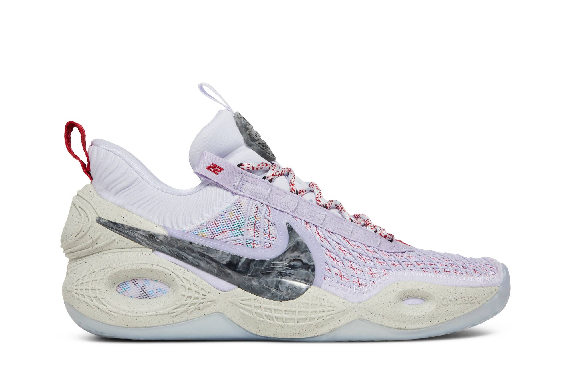 The Nike Cosmic Unity ‘Multi-Color’ delivers a performance basketball shoe developed from the ground up with sustainability in mind. Made with 25% recycled content by weight, the sleek silhouette features a lavender textile upper with a layered cable system, contrast red stitching, and a grey marbled Swoosh. Responsive cushioning is provided by a full-length Zoom Air Strobel, made in part with recycled TPU and stitched directly to a Crater Foam midsole composed of 10% Nike Grind rubber. Underfoot, a translucent rubber outsole features a modified herringbone tread for maximum on-court grip. UPPER MATERIAL Synthetic