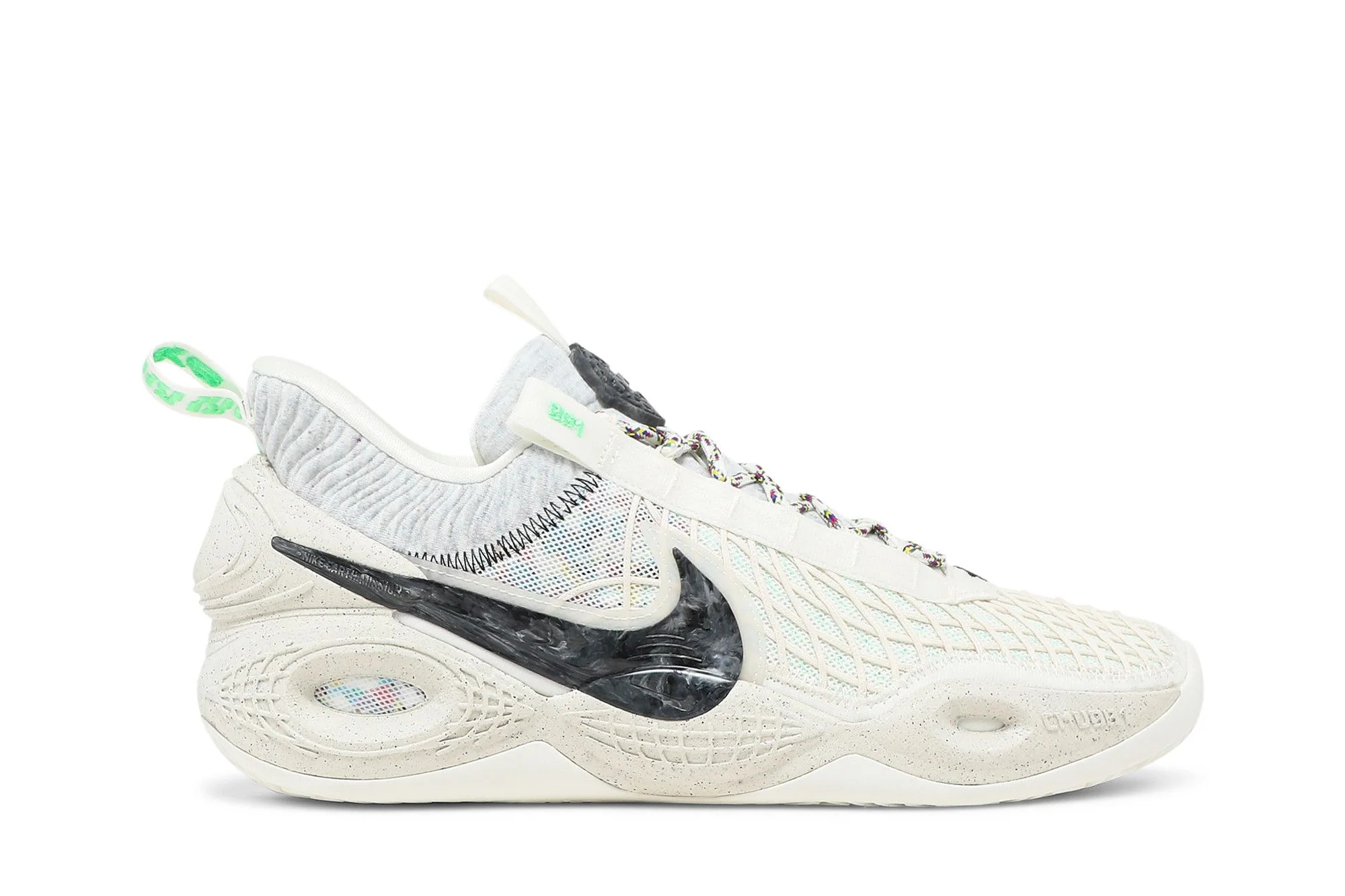 The Nike Cosmic Unity 'Natural' showcases mostly neutral tones on a performance hoops shoe that blends responsive cushioning with a sustainable build made with at least 25% recycled content by weight. The upper is constructed from ivory-hued mesh that reveals hints of vibrant color throughout the textile underlay. A marbled grey finish distinguishes the oversized Swoosh that adorns the lateral side, while bright green accents land on the eyestay and a webbing pull tab at the heel. On-court responsiveness is provided by a full-length Zoom Air Strobel stitched directly to the midsole. UPPER MATERIAL Mesh