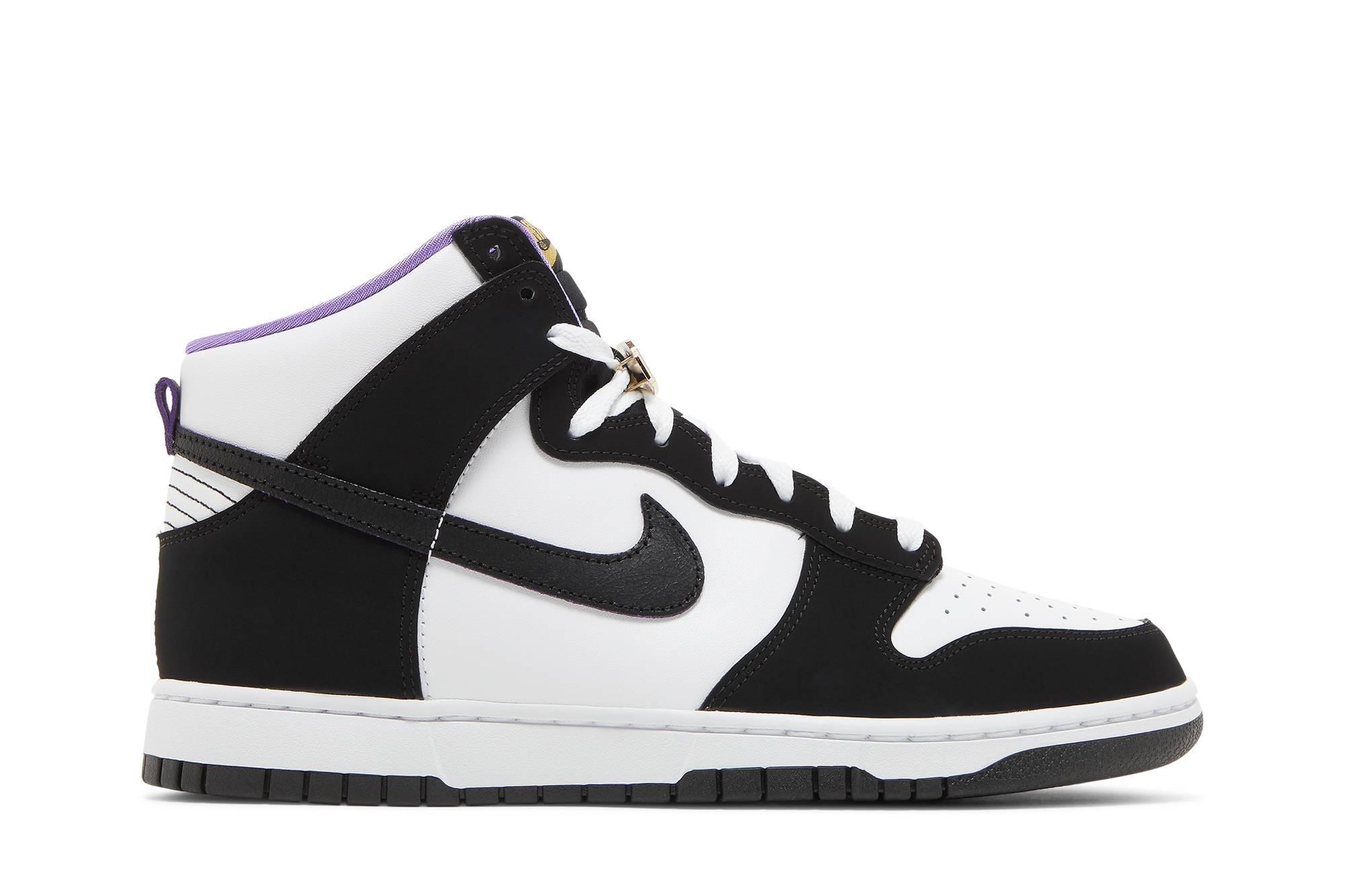 The Nike Dunk High Premium EMB ‘World Champ’ makes over the heritage silhouette with flashy details inspired by the world of professional wrestling. The white leather upper is contrasted by black nubuck overlays and a matching black Swoosh in cracked leather. A woven tongue tag displays a glittering gold Nike logo, while gold-plated lace jewels are modeled after a wrestling championship belt. A textile lining in Action Grape provides an unexpected burst of color. UPPER MATERIAL Leather