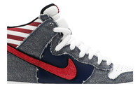 Nike SB gives the Dunk High an all-American makeover with this July 2010 release. The classic high-top features mixed materials on the upper, starting with a white leather toe box and navy leather quarter panel. Frayed blue denim overlays are contrasted by a red denim Swoosh, and the patriotic theme continues with an American flag tongue tag and red and white stripes around the collar.
