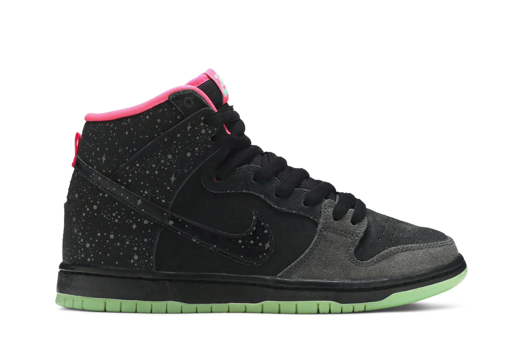 Resembling the spectacular phenomena of the Northern Lights, the Nike SB Dunk High sports a black and grey nubuck formation on the upper, with stellar details and a 3M application on the Swoosh and heel. A glow-in-the-dark outsole and pink sockliner resemble the colorful rays that appear against the night sky.