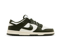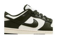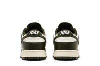 The Nike Dunk Low 'Cargo Khaki' sports a smooth leather upper, highlighted by a white base with olive green overlays and a color-matched Swoosh. Heritage details include a breathable nylon tongue, marked with a woven Nike tag, and breathable perforations on the toe box. A vintage off-white finish is applied to the midsole, supported underfoot by an olive-hued rubber outsole. UPPER MATERIAL Leather