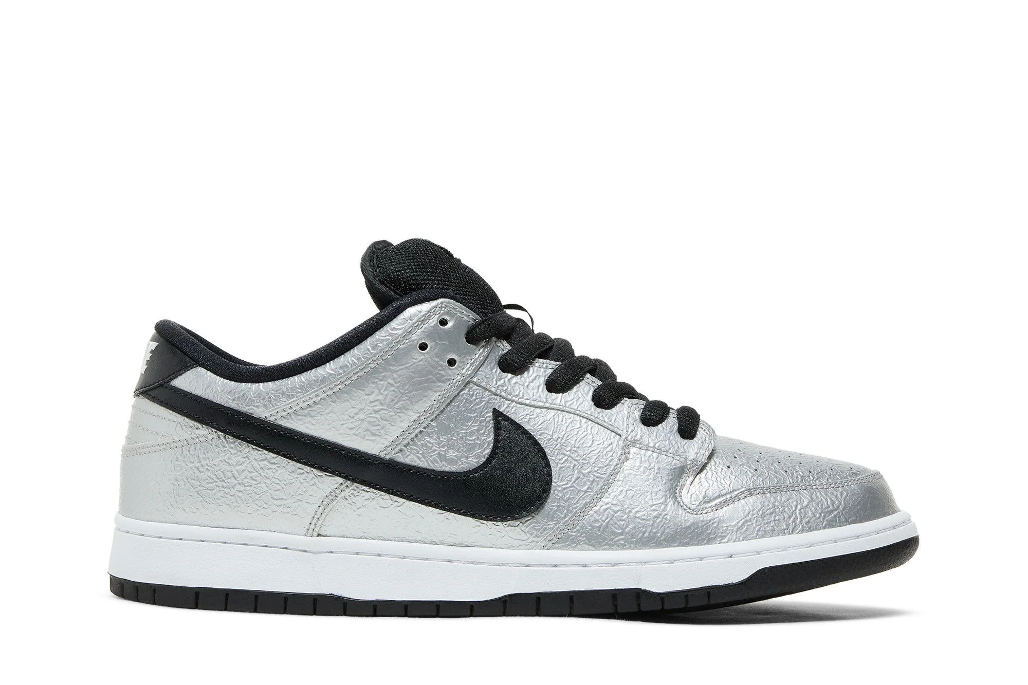 The Nike Dunk Low Pro SB 'Cold Pizza’ dropped on April 20, 2016. It features a crinkled metallic silver upper modeled after the aluminum foil used to wrap leftover pizza slices, with black accents and a pepperoni pizza graphic on the footbed. The low-top skate shoe also comes with Zoom Air cushioning in the sockliner and a black and white midsole/outsole.