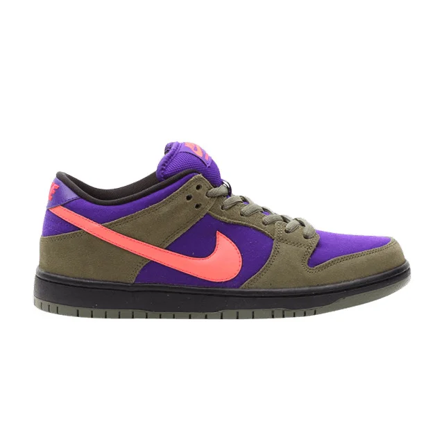 The Nike SB Dunk Low Pro emerges with a combination of olive and Electric Purple hues on the upper’s suede and canvas construction, while Atomic Red accents line the tongue logo and branding. The puffy tongue provides added protection, while the Zoom Air technology in the midsole is included for cushioning.