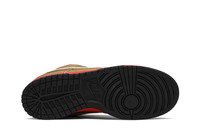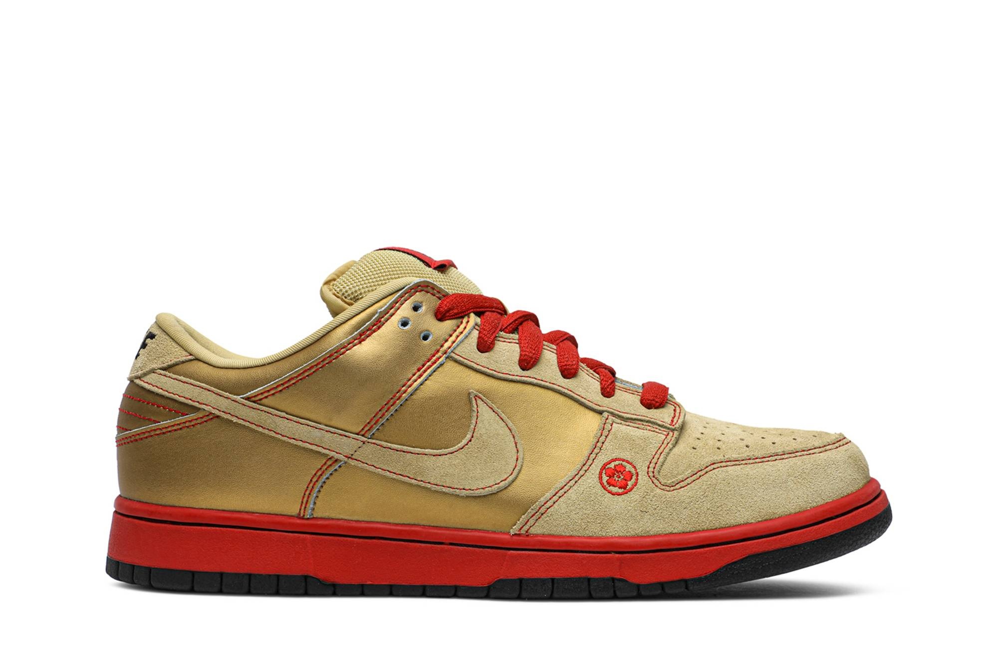 Released in 2007, this Nike Dunk Low Pro SB 'Money Cat’ was inspired by the Maneki Neko, a porcelain cat sculpture often placed in Japanese restaurants and stores to bring good fortune. The low-top skate shoe features a metallic gold synthetic leather upper with Gold Dust suede overlays and red contrast stitching, which matches the midsole. A picture of the Money Cat appears on the insole, while a flower design appears in red near the toe.