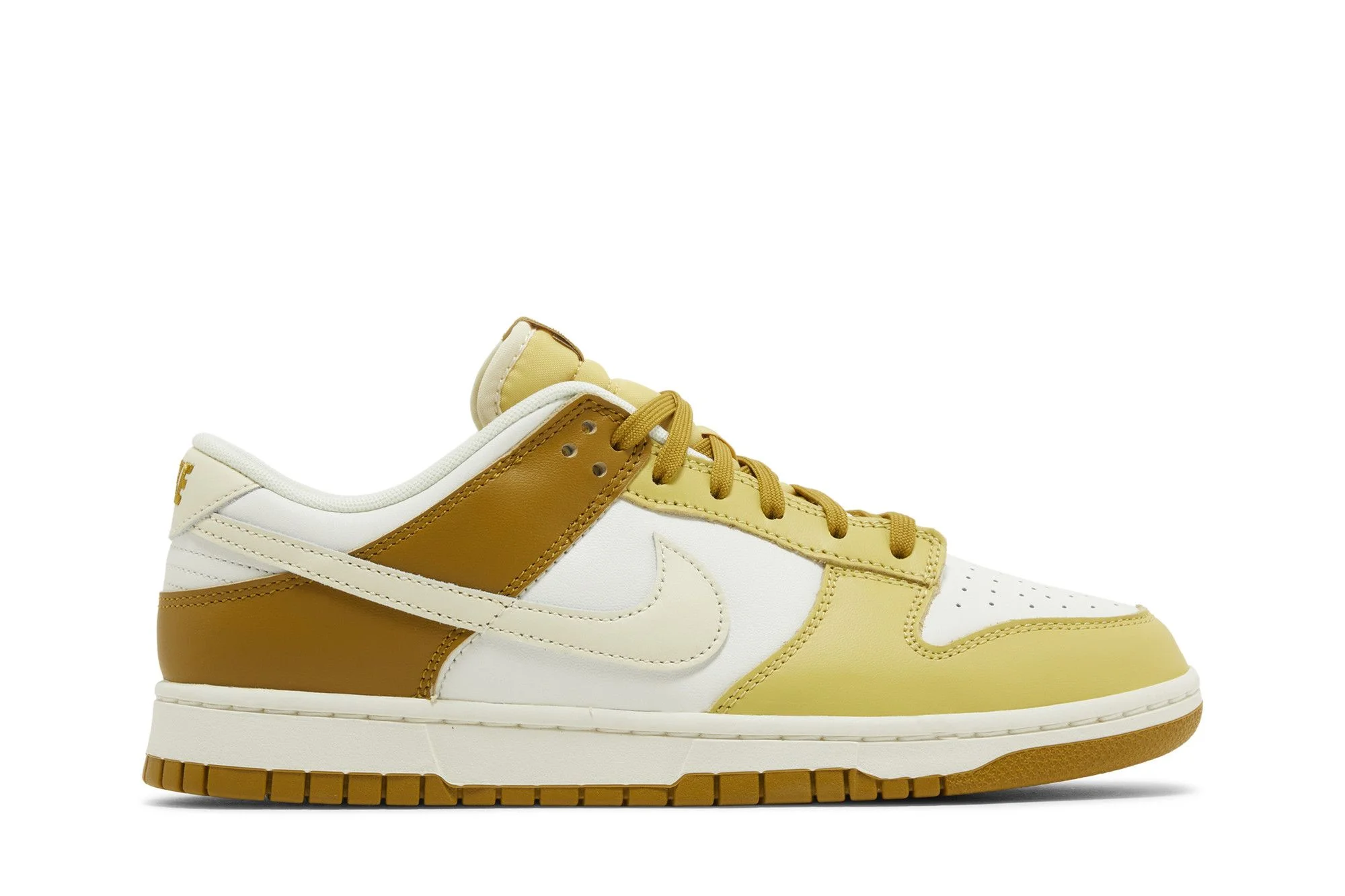 The Nike Dunk Low Retro 'Bronzine' blends a smooth white leather upper with forefoot and heel overlays in varying shades of beige. A subtle ivory finish covers the Swoosh and back tab, ornamented with a Nike wordmark in embroidered block lettering. The cushioning setup is limited to a lightweight foam wedge contained within a durable cupsole. Underfoot, the rubber outsole utilizes a traction pattern designed for pivoting on the hardwood. UPPER MATERIAL Leather