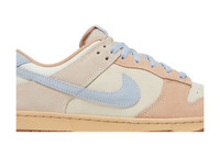 The Nike Dunk Low �Sanddrift Armory Blue� features an upper that replaces traditional leather construction with a supple suede build, awash in cream and beige hues. Powder blue accents land on the Swoosh and back tab, marked with Nike branding in embroidered lettering. The low-top is mounted on a rubber cupsole, featuring stitched sidewall construction and an interior foam wedge for lightweight cushioning. UPPER MATERIAL Suede