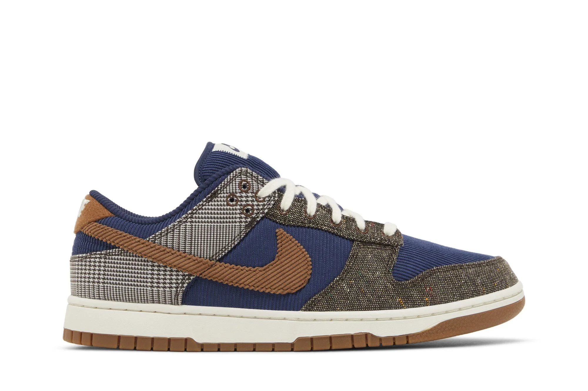 The Nike Dunk Low ‘Tweed Corduroy’ outfits the heritage hoops shoe in a corduroy base in Midnight Navy, contrasted by brown tweed on the eyestay and forefoot overlay. A corduroy Swoosh in a rust brown hue sweeps across the heel overlay, featuring a glen plaid pattern in brown and grey. The autumnal hues are offset by a rubber midsole in a subtle off-white finish. Underfoot, a gum rubber outsole delivers grippy traction. UPPER MATERIAL Textile