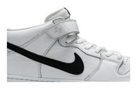 The Nike Dunk Mid SB 'Orange Label' is an updated take on a classic skate shoe that is presented with a white and black color scheme and sold exclusively at skate shops. The low-cut model released in June 2019 with a nubuck leather upper, padded collar and tongue, and midfoot strap, collectively promoting a comfortable, secure fit. The iconic Nike Swoosh is prominently displayed on the quarter panel, while toe box perforations and a durable rubber outsole with a circular traction pattern finish the style.