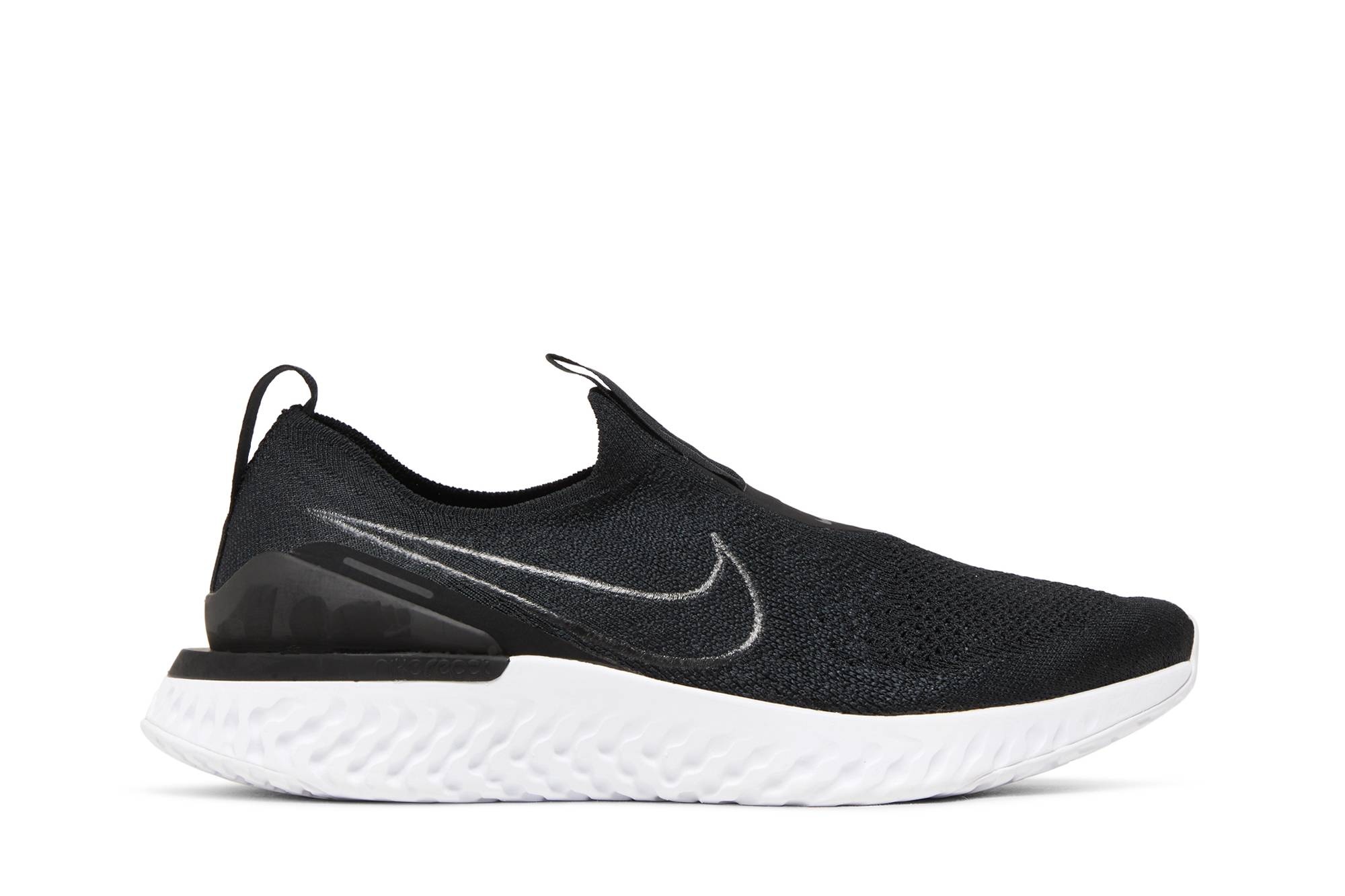 The Nike Epic Phantom React Flyknit 'Black' was released in May 2019 with a stealthy colorway defining its extra-lightweight construction. Created for toughness without sacrificing range of motion, the upper is made of stretchy Flyknit fabric integrated with engineered yarn on the sides for natural motion and lateral stability. A molded heel cage builds on the support motif, and React foam with a pressure-mapped outsole creates a responsive ride. UPPER MATERIAL Flyknit