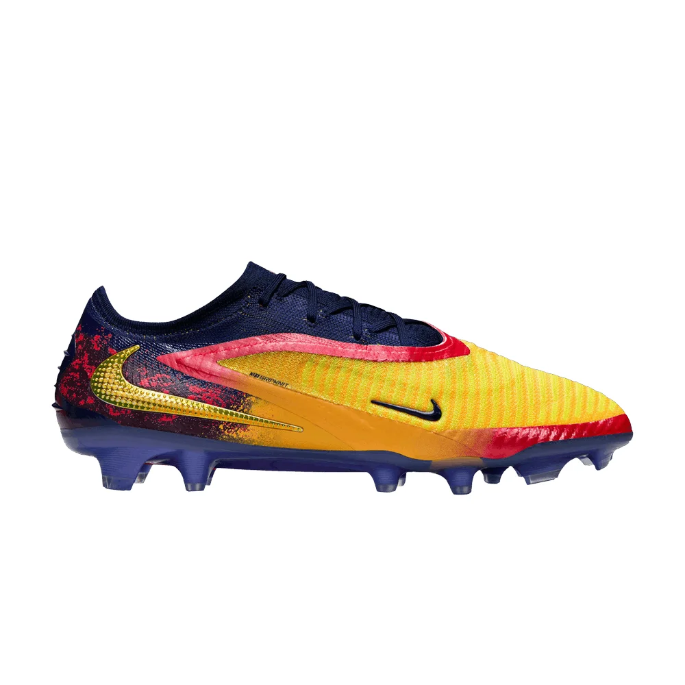 The Erling Haaland x Nike Phantom 6 Low Elite FG 'Precision Under Pressure' is secured with asymmetrical lacing. A knit upper in Lemon Venom, Laser Orange and Blue Void features Gripknit technology, a sticky texture that enables enhanced control when dribbling and shooting. A crimson splatter print enlivens the heel, while an inverted textured Swoosh in a metallic gold finish shines on the lateral side. UPPER MATERIAL Gripknit