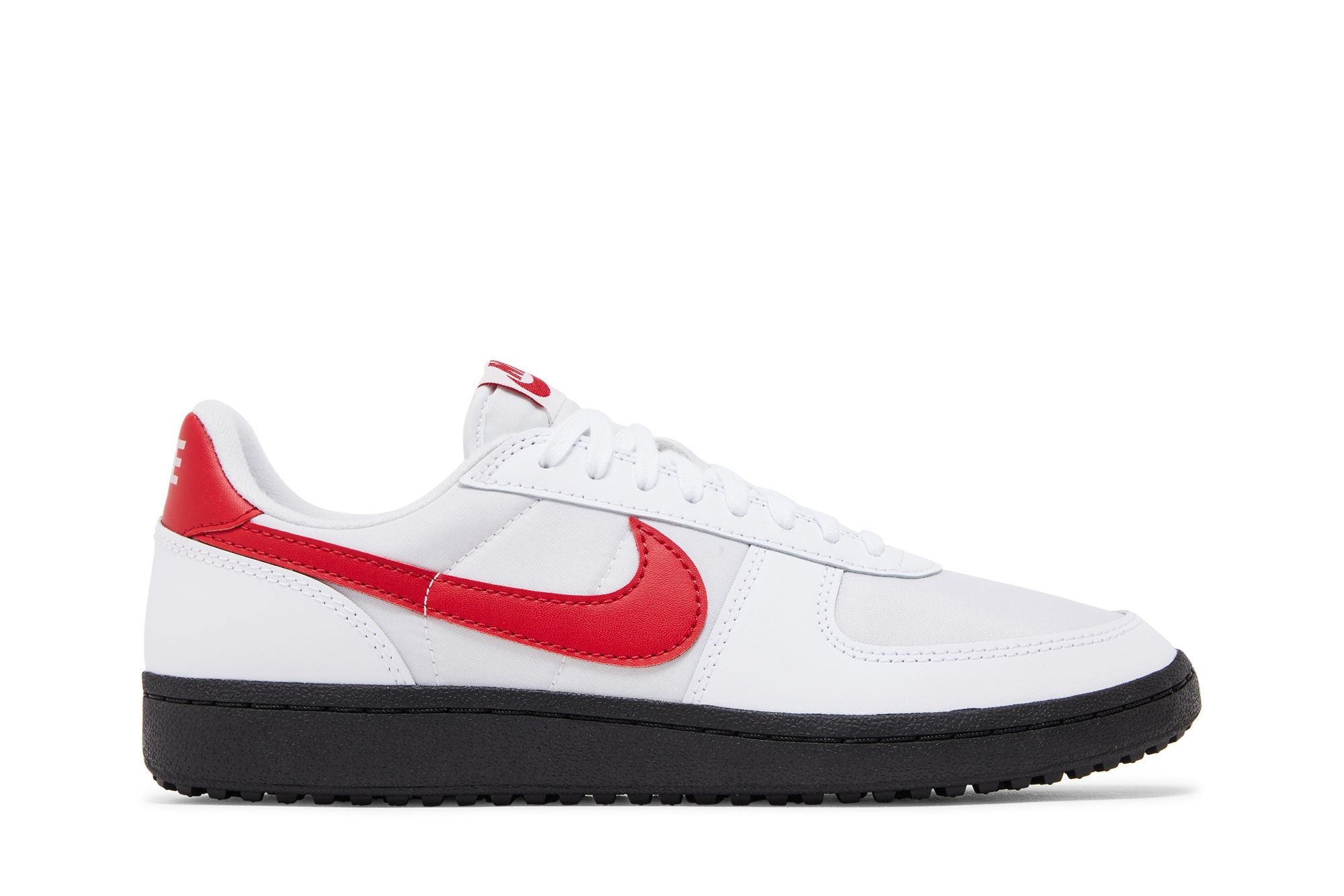 The Nike Field General 82 SP 'White Varsity Red' brings back a vintage football training shoe worn by various NFL players. The low-top carries a white textile upper with tonal leather overlays at the forefoot and heel. Varsity Red accents make their way to the signature Swoosh, back tab, and woven Nike tongue tag. A solid black finish is applied to the rubber cupsole, featuring stitched sidewall construction and grippy outdoor lugs on the outsole. UPPER MATERIAL Nylon