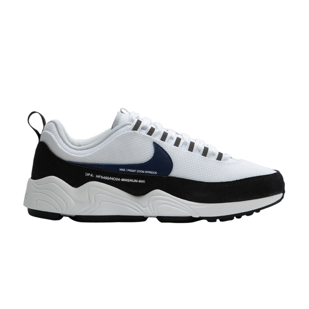 The Fragment Design x Nike Air Zoom Spiridon 'White Blue Void' is drawn from a collaborative two-piece pack. The upper combines breathable white mesh with a contrasting black suede mudguard. A navy leather Swoosh, marked with 'NIKE / FRGMNT ZOOM SPIRIDON,' graces the lateral side, while a white leather Swoosh adorns the opposite side. The sneaker is mounted on a wavy foam midsole with springy Zoom Air cushioning. UPPER MATERIAL Mesh