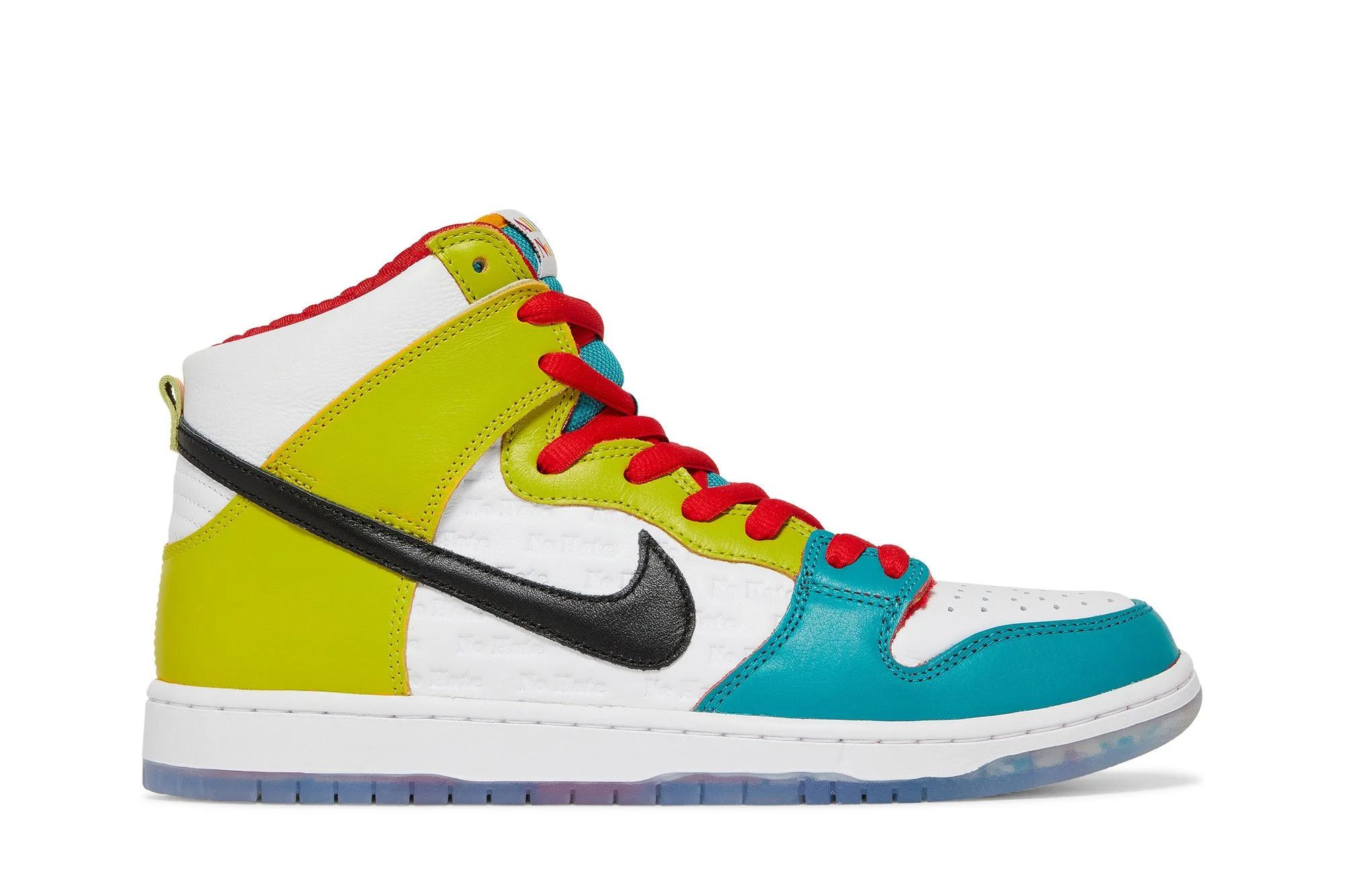 The froSkate x Nike Dunk High SB ‘All Love No Hate’ features a moniker expressing the ethos of a Chicago-based skate crew representing BIPOC women and members of the LGBTQ community. Reflecting the shoe’s inclusivity theme, the high-top carries a white leather upper with mismatched overlays in contrasting crimson, gold, teal, and lime hues. Unique details include quilted liners, heart-shaped perforations on the toe box, and ‘All Love’ and ‘No Hate’ debossed on the quarter panel. The phrase is repeated on the right tongue tag, while froSkate branding appears on the left tongue tag. A translucent rubber outsole reveals a multicolor pattern underfoot. UPPER MATERIAL Leather