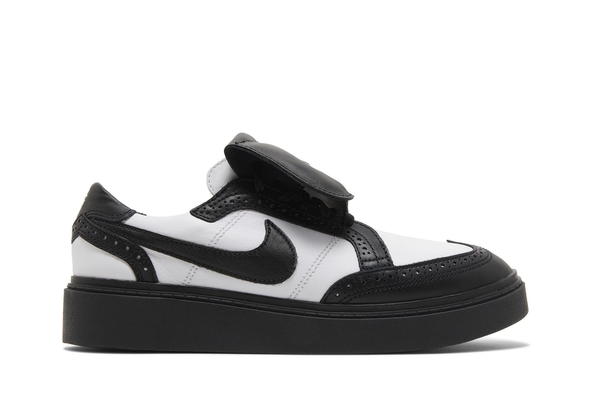 The G-Dragon x Nike Kwondo 1 ‘Yin-Yang’ reflects the K-pop artist’s personal style, blending street-ready sensibilities with a traditional dress shoe aesthetic. The black and white leather upper features a wingtip-inspired design, highlighted by brogue detailing on the forefoot and heel overlay. Removable lace shrouds display mismatched Nike and PEACEMINUSONE branding, while G-Dragon’s daisy graphic is embroidered on the heel tab. The two-tone design is finished with a rubber midsole in a solid black finish. UPPER MATERIAL Leather