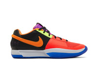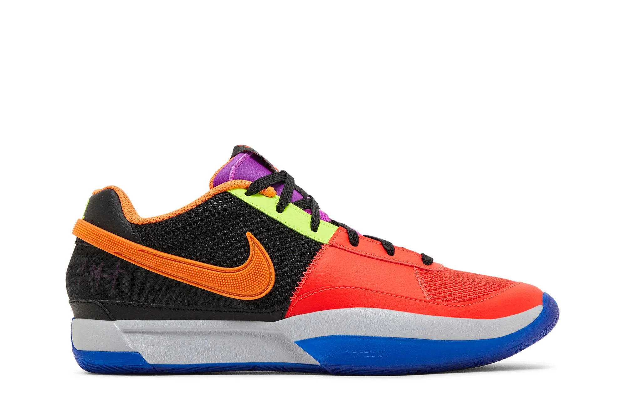 The Nike Ja 1 ‘Check’ sports a breathable mesh upper in black and Bright Crimson. A tonal synthetic leather overlay reinforces the forefoot, while a TPU Swoosh in Bright Mandarin wraps around the heel. The low-top rides on a lightweight Phylon midsole with springy Zoom Air cushioning in the forefoot. The blue translucent rubber outsole reveals Ja Morant’s quote upon signing with Nike: ‘Now I’m proud to say I work for the check.’ UPPER MATERIAL Mesh