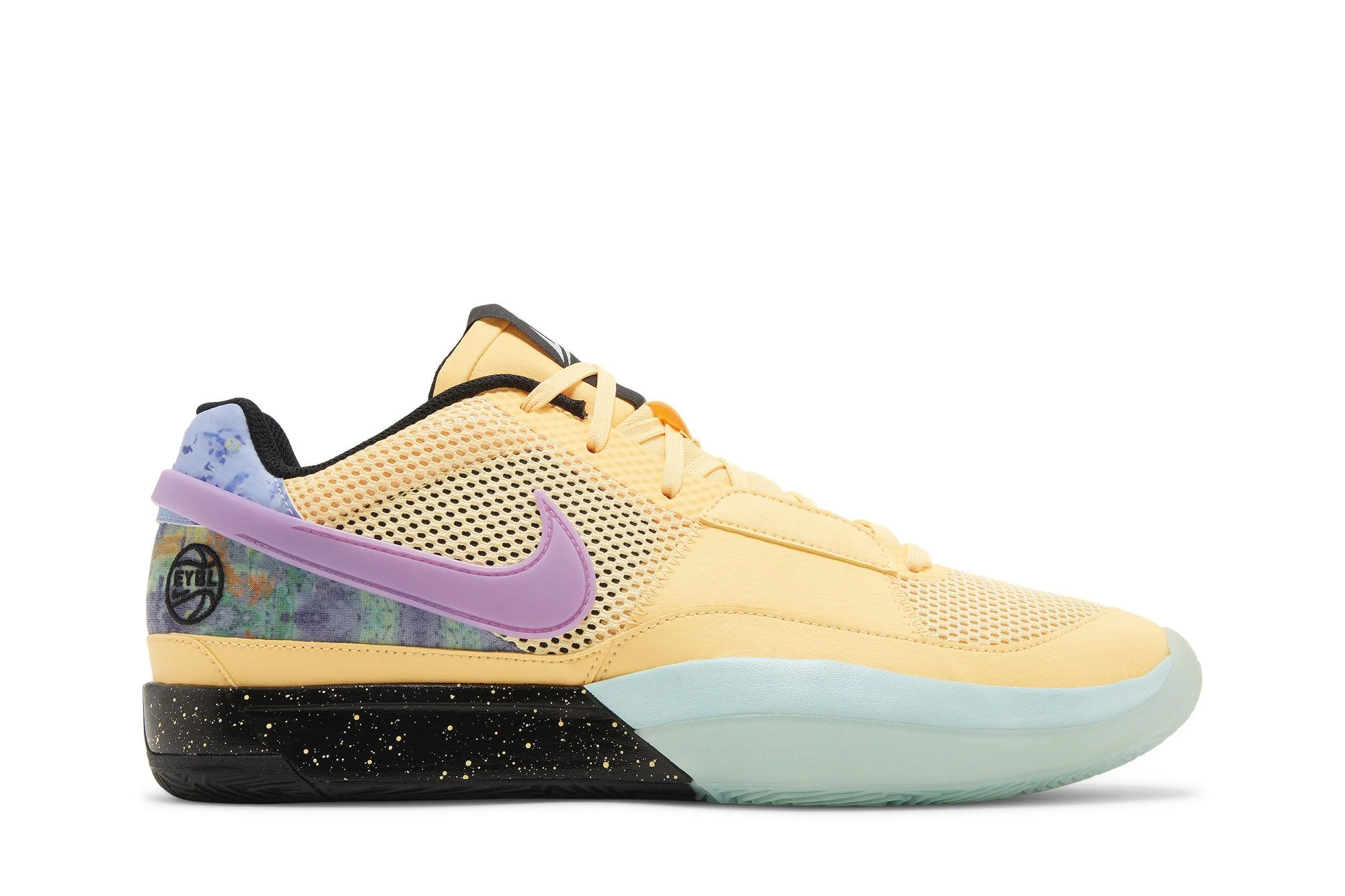 The Nike Ja 1 ‘EYBL’ celebrates Nike’s Elite Youth Basketball League with a colorful rendition of Ja Morant’s debut signature shoe. The upper blends open mesh construction in Melon Tint with tonal synthetic leather overlays and a wraparound TPU Swoosh in a bright purple hue. A multicolor pattern enlivens the heel, marked with an embroidered EYBL logo on the lateral side. The low-top rests on a two-tone Phylon midsole, featuring a Jade Ice finish throughout the forefoot and a solid black heel with speckled detailing. A forefoot Zoom Air unit provides on-court responsiveness. UPPER MATERIAL Mesh