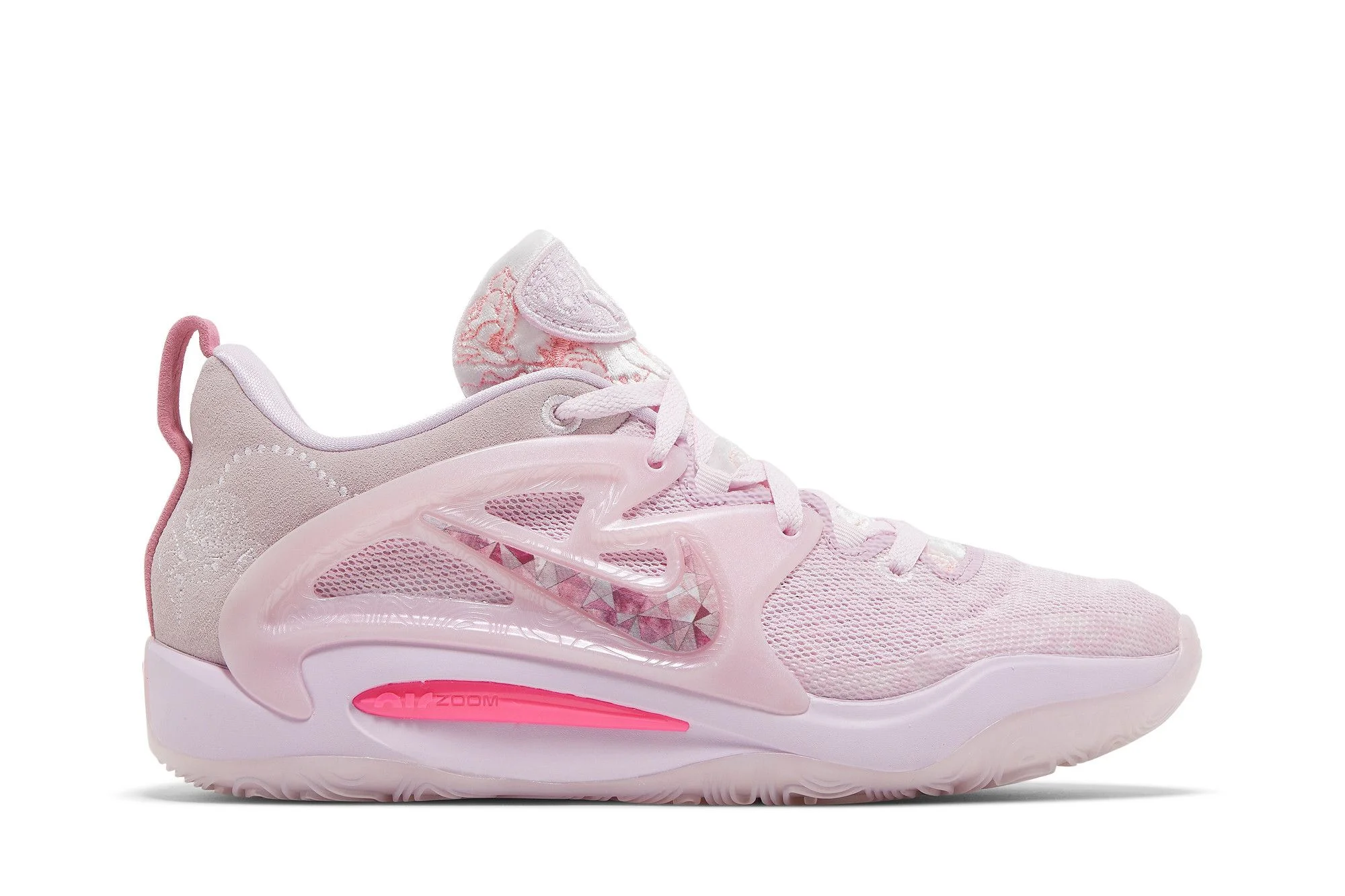 The Nike KD 15 NRG ‘Aunt Pearl’ honors a lasting influence in Kevin Durant’s life. Through several iterations of KD’s signature line, Nike has paid homage to the athlete’s late Aunt Pearl with a tonal pink finish and unique details. This pair features a floral print throughout the upper, built with a combination of mesh, suede and molded TPU. Crushed velvet tongues are marked with KD patches, while ‘Aunt Pearl’ is inscribed on the right pull tab. Performance benefits include a full-length Cushlon midsole and a visible Air Zoom Strobel unit. UPPER MATERIAL Mesh