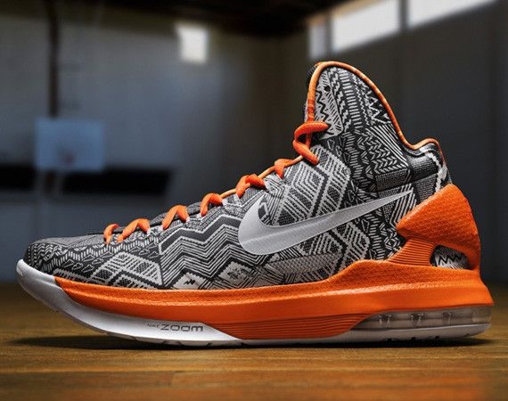 To celebrate Black History Month in 2013, Nike honored three athletes—Serena Williams, Didier Drogba, and Kevin Durant—with their 'Black History Month' sneaker collection. Durant's shoe, the Nike KD 5 'BHM' sneaker, features African-inspired prints on its synthetic construction, awash in Sport Grey and Total Orange coloring. Signature KD and BHM detailing appear subtly at the toe, tongue, and heel while a hard-to-miss heel counter helps support your ankle.