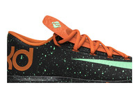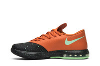 Designed by Leo Chang, the Nike KD 6 dropped in 2013. Featuring an ultra thin two-layer Hyperfuse upper with Flywire cables, Zoom Air in the forefoot, Max Air in the heel and a hexagon traction pattern on the outsole. A tribute to Kevin Durant's season playing for the Texas Longhorns, this KD 6 'Texas' model features orange Hyperfuse on the throat and medial side of the shoe, and Green Glow speckles on the black Hyperfuse that wraps around the lateral side to the toe. Glow-in-the-dark Green Glow accents the Swoosh branding at the toe and ankle, the speckled detailing on the black midsole, and the heel of the outsole.