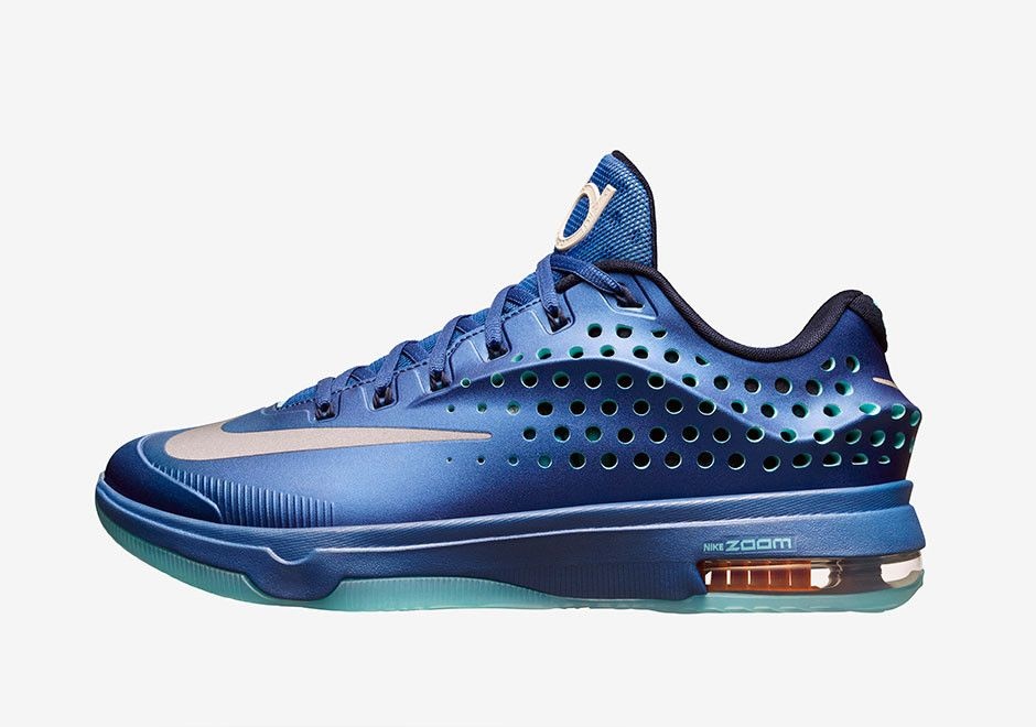 The Nike KD 7 Elite ‘Elevate’ released alongside Elite versions of the Kobe X and LeBron 12 in May 2015. The low-top is built with perforated Hyperposite construction on the lightweight upper, finished in a metallic Gym Blue shade. In addition to Flywire cables for a snug fit, performance features include a Zoom Air unit in the heel with structural pillars in contrasting orange.