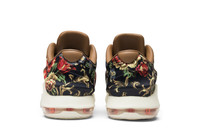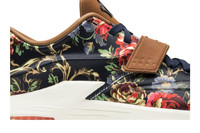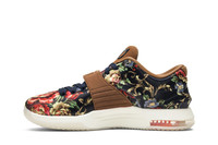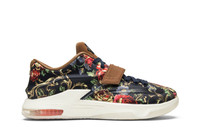 The Nike KD 7 EXT Floral QS was a quick-strike release in February 2015. The Midnight Navy, black, and hazelnut colorway features a unique floral graphic on the upper, hazelnut midfoot strap and tongue, white midsole, and an ice-blue translucent outsole.