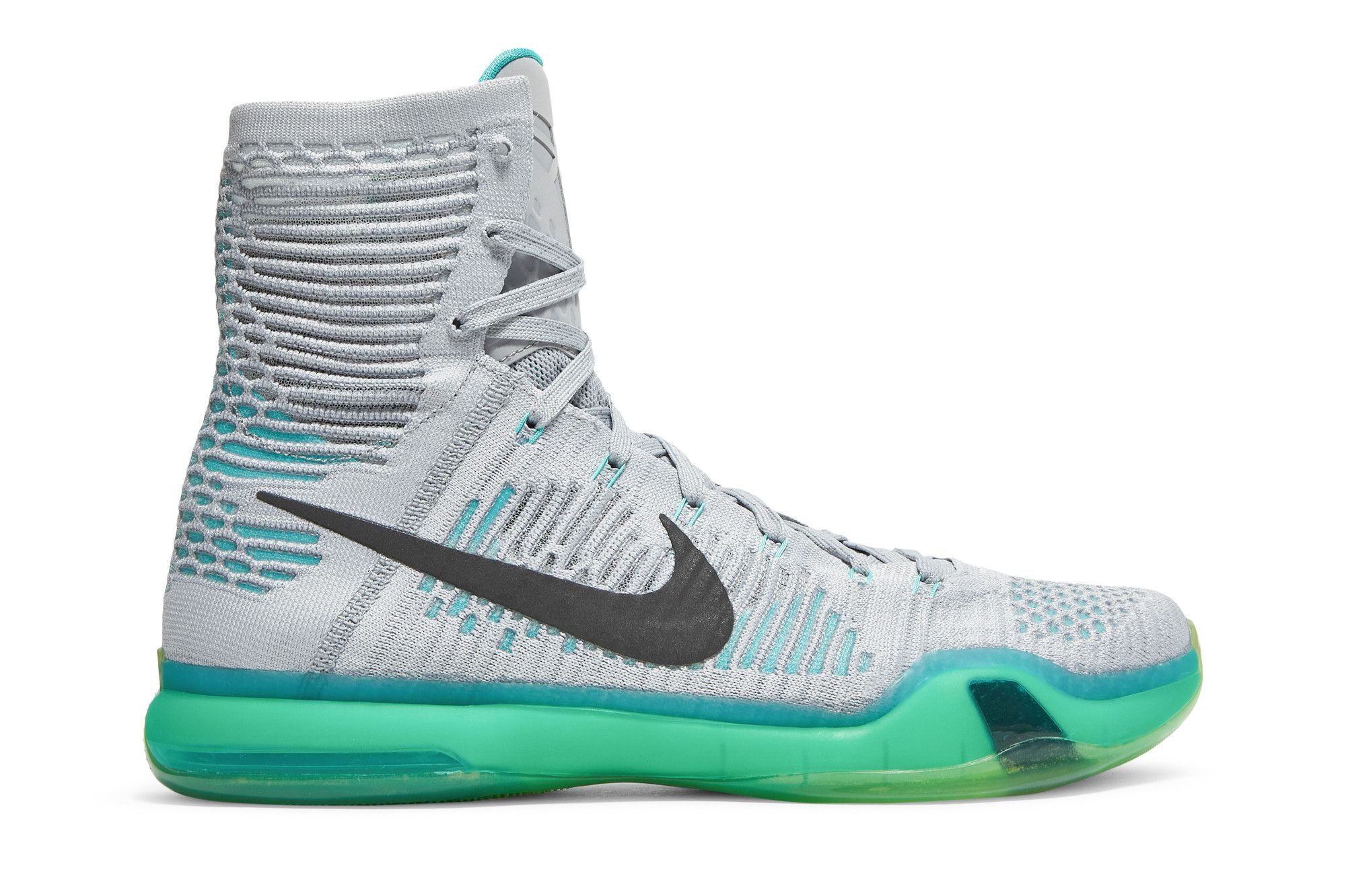 The Elite edition of the Kobe 10 modifies the original low-profile signature model, including a polyester yarn finish covering a significantly elevated high-top construction. The ‘Elevate’ model showcases a teal and Wolf Grey colorway across the Flyknit upper. A translucent Emerald Green midsole conceals a carbon fiber midfoot shank, while four red stripes—signifying Bryant’s 2013 Achilles injury—appear on the left shoe only.