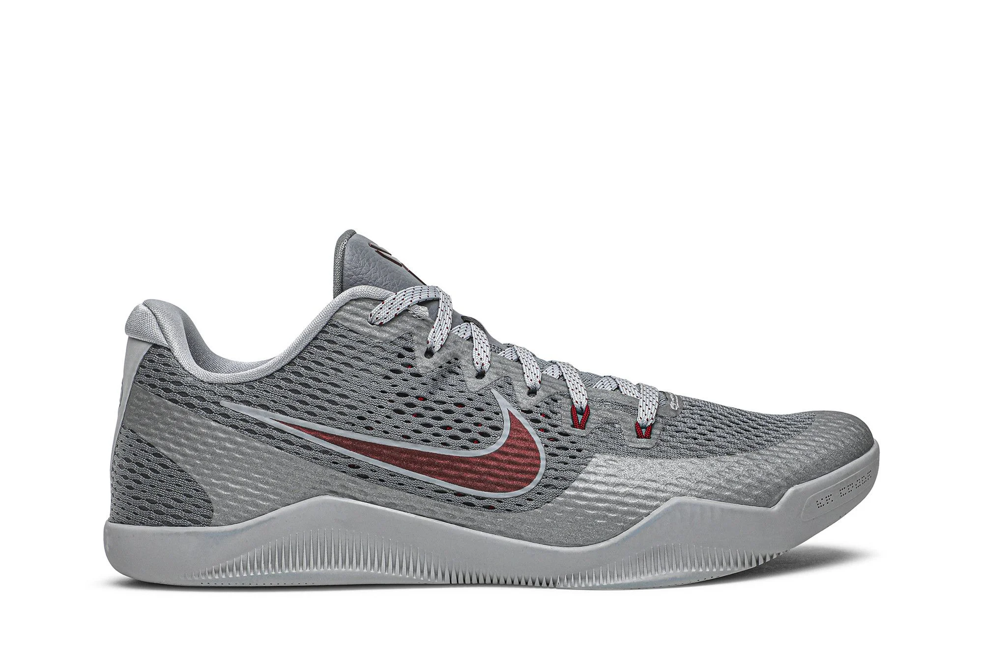 The Nike Kobe 11 ‘Lower Merion’ is a tribute Kobe Bryant’s alma mater, Philadelphia’s Lower Merion High School. Dressed in the school’s colors, the shoe’s Engineered Mesh upper combines Cool Grey, Wolf Grey and Team Red with 3M reflective highlights on the mudguard and eyestay. The low-top shoe includes a Lower Merion Aces logo on the right heel, with Bryant’s signature stitches on the left.