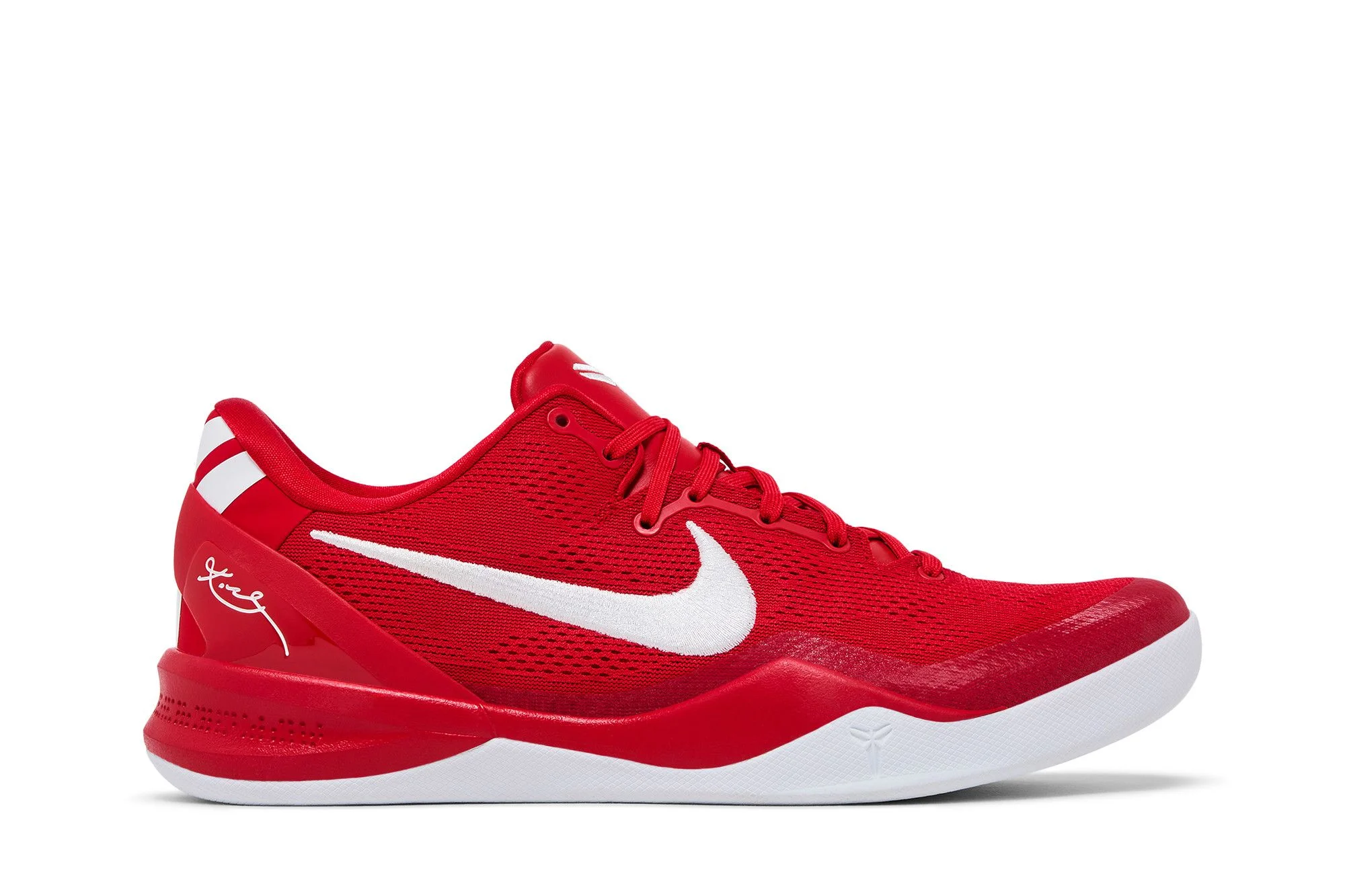 The Nike Kobe 8 Protro 'University Red' is crafted from crimson engineered mesh with contrasting white accents, including an embroidered Swoosh and Kobe Bryant's signature sheath logo on the tongue and back heel. Lightweight cushioning comes courtesy of a full-length drop-in React foam midsole. Underfoot, the white rubber outsole features a herringbone traction pattern and an exposed carbon fiber shank. UPPER MATERIAL Mesh