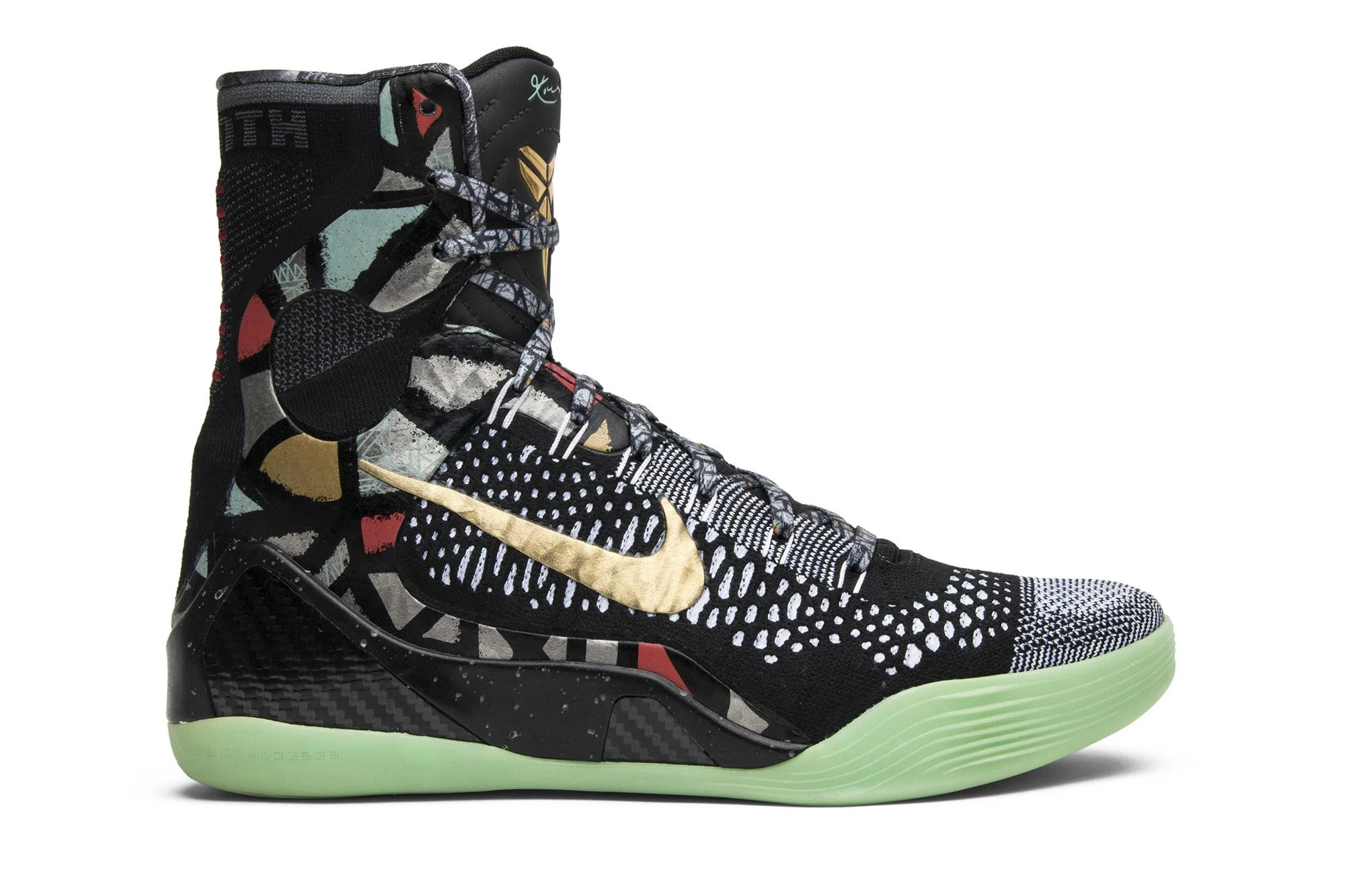 Part of the 2014 NBA All-Star Collection, the Kobe 9 Elite 'NOLA Gumbo League - Maestro' is constructed with a black and white Flyknit upper contrasted with golden accents on the Swoosh and branding, while a myriad of New Orleans inspired motifs can be spotted on the heel and sockliner. The shoe is finished with a neon green outsole that won’t go unnoticed, thanks to a glow-in-the-dark overlay. UPPER MATERIAL Flyknit