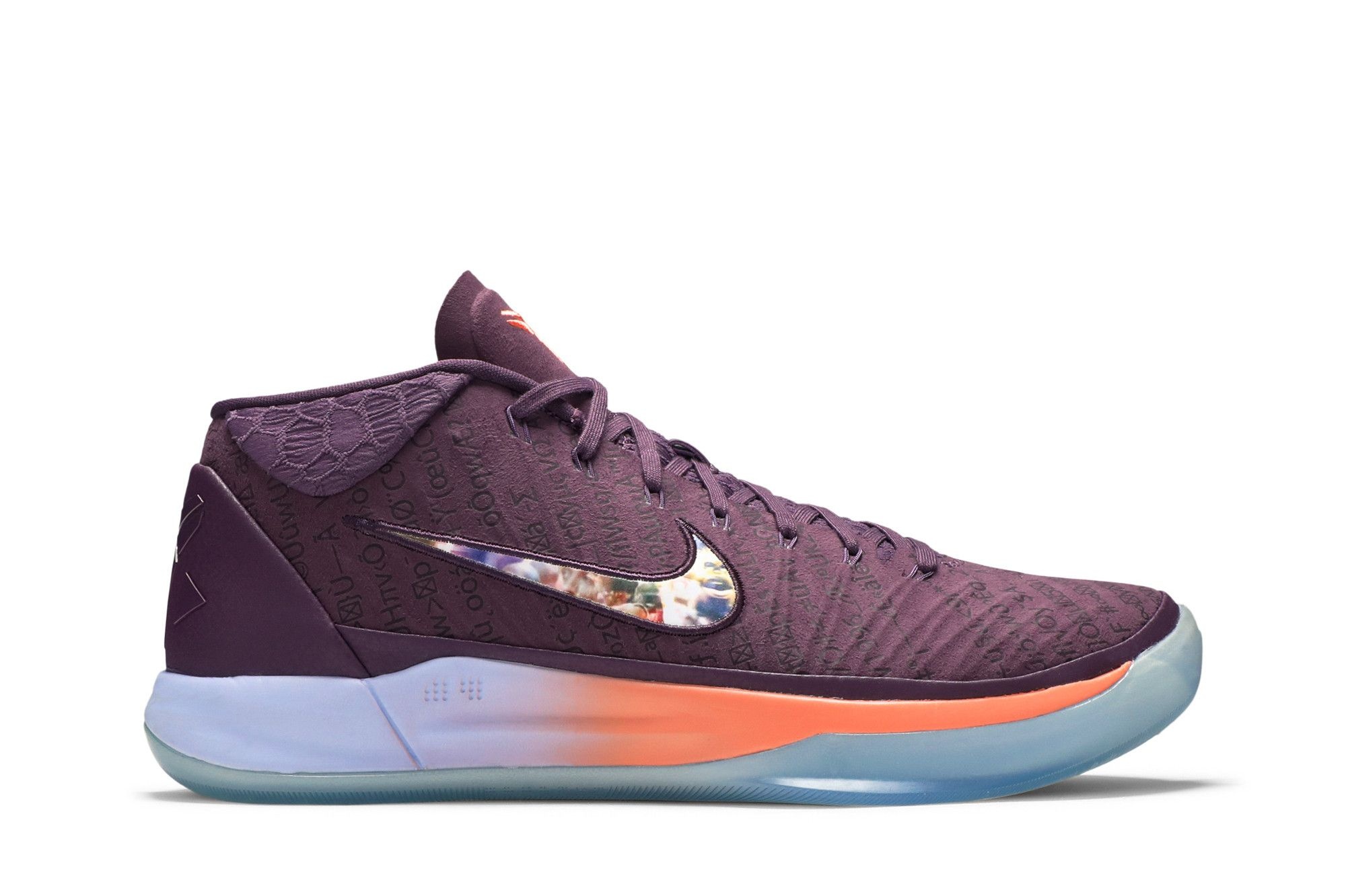 Released in April 2018, this Nike Kobe AD was a PE created for Phoenix Suns shooting Guard Devin Booker. In March 2017 Booker became the youngest player to score over 60 points in a game at 20 years of age. His 70 points against the Boston Celtics also enrolled him in the exclusive six-member 70 club with Wilt Chamberlain, David Robinson, David Thompson, Elgin Baylor, and Kobe Bryant. The Phoenix Suns-inspired colorway features a Pro Purple upper with an orange midsole and icy blue translucent outsole. It also comes with screen-printed photos of Booker on the Nike Swoosh and insole.