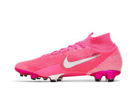 The Kylian Mbappé x Nike Mercurial Superfly 7 Elite FG 'Pink Panther' dresses the high-speed soccer cleat in a vibrant finish designed to stand out on the pitch. The upper is composed of pink Flyknit with an ultra-thin NIKESKIN overlay for improved durability and touch. In addition to traditional lace closure, a Dynamic Fit collar wraps the ankle for a supportive fit. The outsole features angular studs and a Nike Aerotrak forefoot plate that snaps back into place with every step. UPPER MATERIAL Flyknit