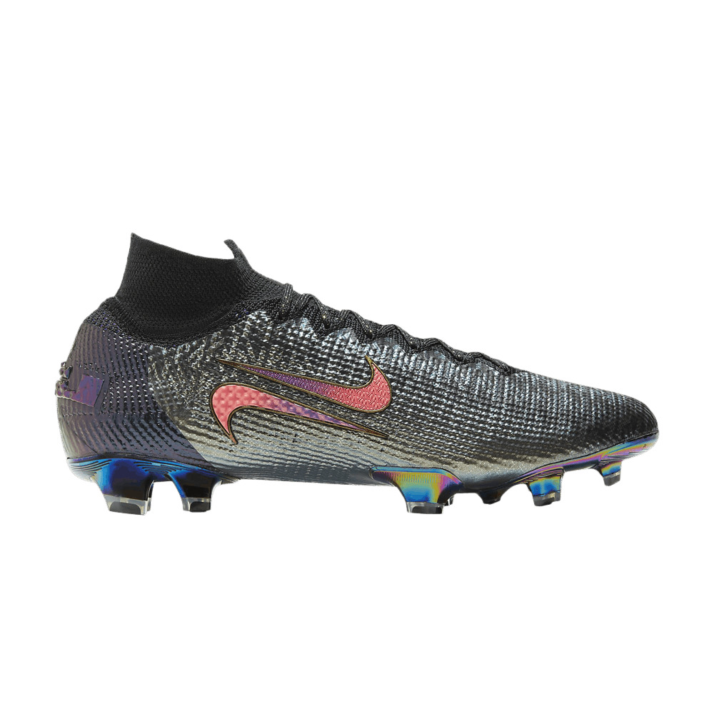 The Kylian Mbappe x Nike Mercurial Superfly 7 Elite FG ‘The Chosen 2’ is the companion colorway to a similarly themed LeBron 18, bringing together two iconic athletes bound by a strong commitment to their respective sports and communities. This pair makes use of a 360-degree Flyknit upper, protected with an iridescent NikeSkin overlay and accented with mismatched LJ and KM branding on the tongue and heel of each shoe. Angular studs provide maximum grip underfoot. UPPER MATERIAL Flyknit