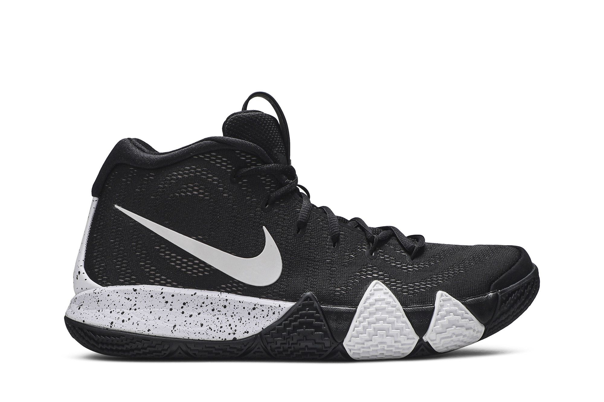 The Kyrie 4 'Black' was designed to provide maximum traction, cushioning and a locked-down feel that Kyrie Irving needs on the court. The signature sneaker boasts a black Flyknit upper with Flywire cables for extra support, a Zoom Air unit in the heel for cushioning and white accents on the speckled midsole, Swoosh branding on the sidewall and heel. The sneaker also sports an outsole with a curved construction and micro-tread.
