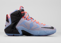 The Easter iteration of the Lebron 12 fuses Light Violet and Aluminum on the Hyperfuse upper with Sunset Glow orange accents at the laces and lateral side Swooshes. In contrast to the pastel hues, black appears on the Hyperposite overlays and additional toe Swooshes. Finishing off the look are vibrant hits of Hot Lava on the inner lining, heel pull tabs, and signature hexagonal outsole units.