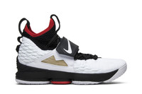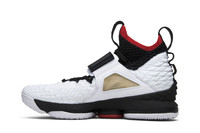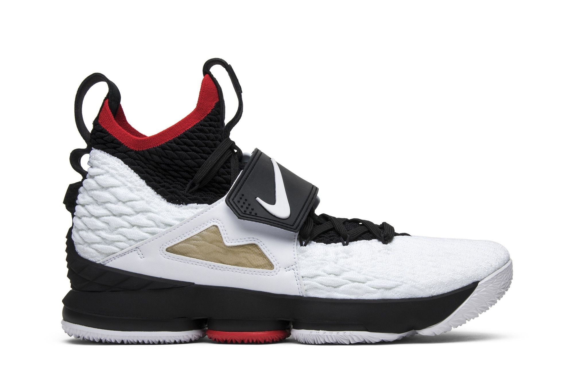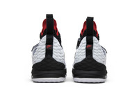 Drawing from an old Deion Sanders signature shoe, this Lebron 15 celebrates LeBron’s love of the Diamond Turf trainer from the 1990s. The LeBron 15 'Diamond Turf' PE features a white and black Flywire upper with a sock-like fit, red detailing on the collar and outsole, and a cross-strap on the midfoot. The high top also features white Swoosh branding on the strap and the Diamond Turf Logo. This colorway was part of the ‘LeBron Watch’ series of LeBron 15 colorways.