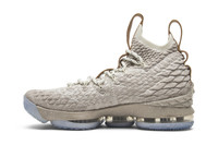 Released in October 2017, the Nike LeBron 15 'Ghost' features a light tan BattleKnit upper with Vachetta Tan leather tabs, Sail accents, tonal speckled midsole, and an icy blue translucent outsole. A combination of Nike Zoom Air and Max Air wrapped in a foam midsole is utilized for lightweight, responsive cushioning. UPPER MATERIAL BattleKnit