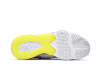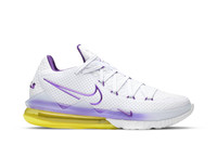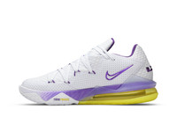 The Nike LeBron 17 Low ‘Lakers’ pays homage to LeBron James’ third NBA team, highlighted by the franchise’s signature hues. The low-top uses a white mesh upper with a perforated leather overlay in matching white, along with Voltage Purple accents on the lace loops and branding elements. The large-volume Max Air unit under the heel is tinted in Dynamic Yellow. ‘LeBron James’ is printed on the custom sockliner in lettering that recalls the Lakers’ logo. UPPER MATERIAL Knitposite