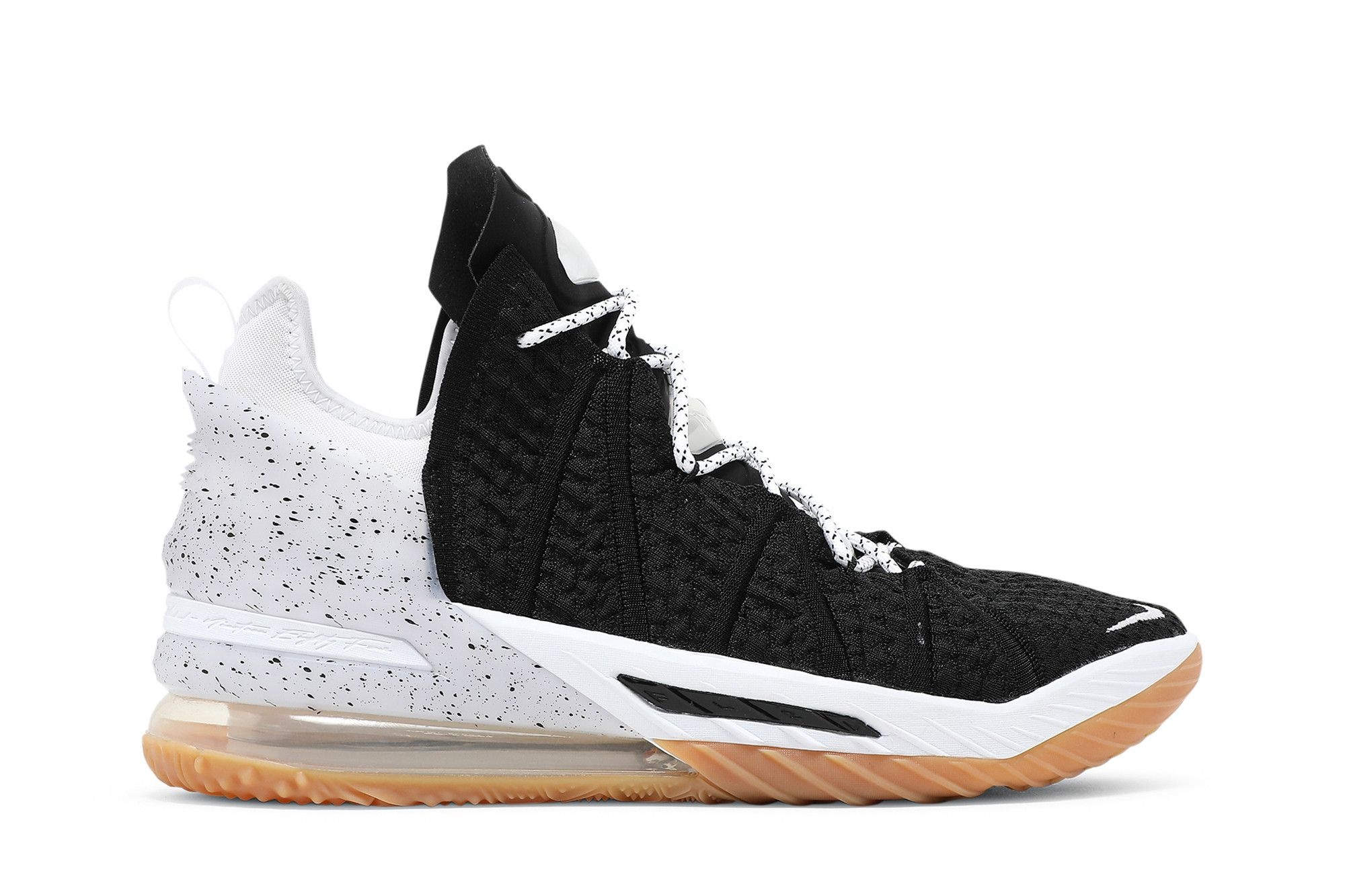 The Nike LeBron 18 ‘Black White Gum’ delivers an essential colorway of LeBron James’ 18th signature shoe. A solid black finish is applied to the Knitposite 2.0 upper, featuring integrated lacing and a contrasting white TPU heel counter covered in speckled detailing. The sneaker’s innovative cushioning setup features Cushlon foam and full-length Zoom Air that’s partially housed within a large-volume Max Air unit nestled in the heel. Underfoot, a gum rubber outsole uses a grid-like traction pattern for maximum grip. UPPER MATERIAL Knitposite