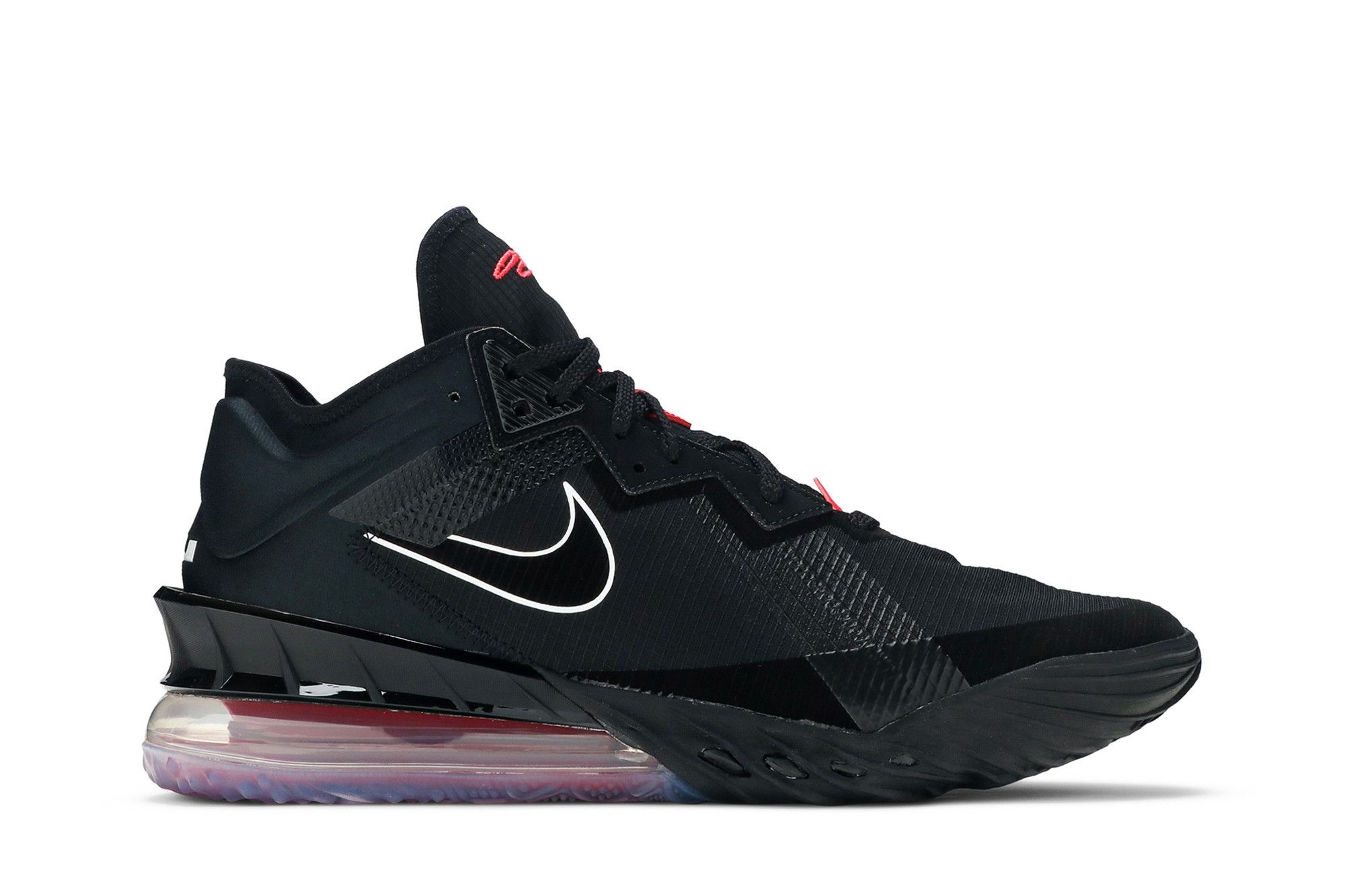 The Nike LeBron 18 Low ‘Bred’ combines a low-profile build with an essential color scheme virtually synonymous with Nike heritage. Black woven textile is utilized on the upper, fortified with a series of tonal no-sew overlays and an external heel clip that locks in the back of the foot. Contrasting red accents atop the tongue include LeBron James’ embroidered signature. Lightweight cushioning arrives via a React foam midsole, supplemented by a crimson-tinged Max Air unit under the heel. UPPER MATERIAL Knitposite