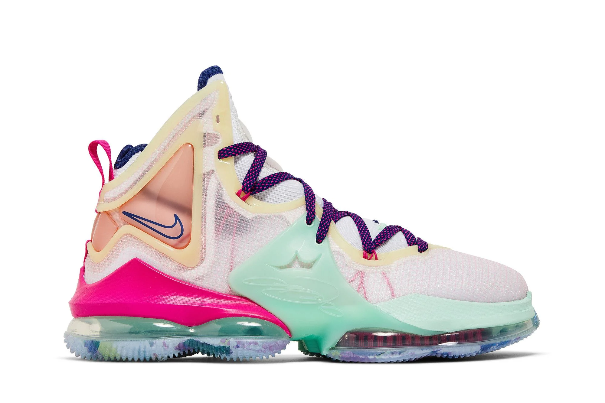 The Nike LeBron 19 ‘Valentine’s Day’ injects LeBron James’ signature shoe with vibrant pops of color. A subtle pink tinge permeates the translucent woven upper, featuring fuchsia Flywire cables and mint green TPU wings integrated into the laces. Foam pods line the collar for enhanced ankle support, while a magenta-colored heel counter provides rearfoot stability. The sneaker is mounted on a hybrid setup that combines a 360-degree Max Air heel unit with responsive Zoom Air cushioning in the forefoot. UPPER MATERIAL Textile