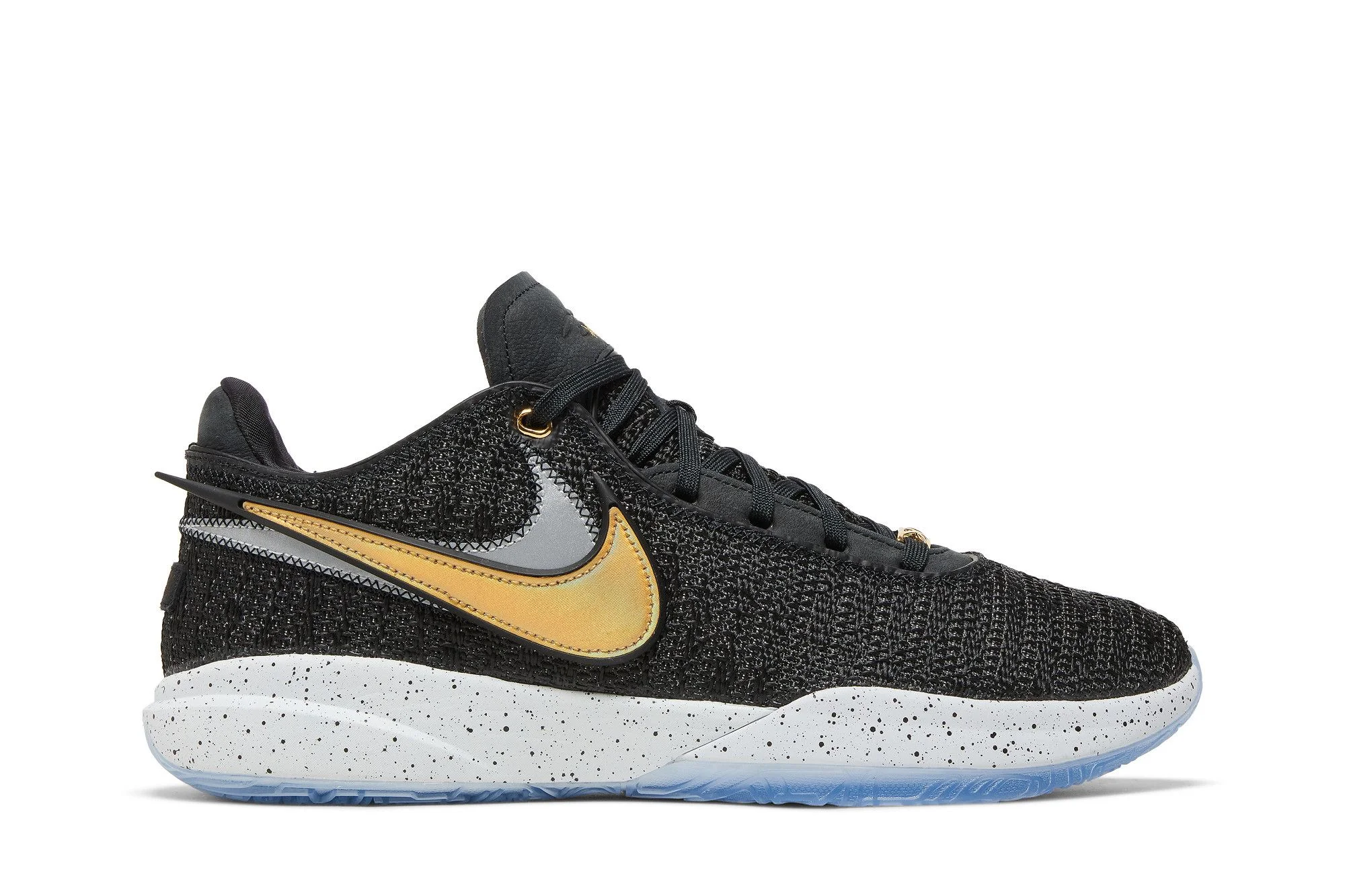 The Nike LeBron 20 ‘Fab 5’ pays tribute to LeBron James’ high school teammates at Saint Vincent-Saint Mary. The performance hoops shoe features breathable black knit construction with metallic gold accents. They make their way to the upper eyelets, ‘XX’ lace dubrae, and the signature Swoosh, overlaid on a secondary silver Swoosh on the lateral side. Speckled detailing is applied to the Cushlon midsole, fitted with a large forefoot Zoom Air unit and a bottom-loaded Zoom Air bag in the heel. Underfoot, a translucent rubber outsole reveals LeBron James’ Dunkman logo in green — a subtle nod to the athlete’s SVSM squad. UPPER MATERIAL Mesh
