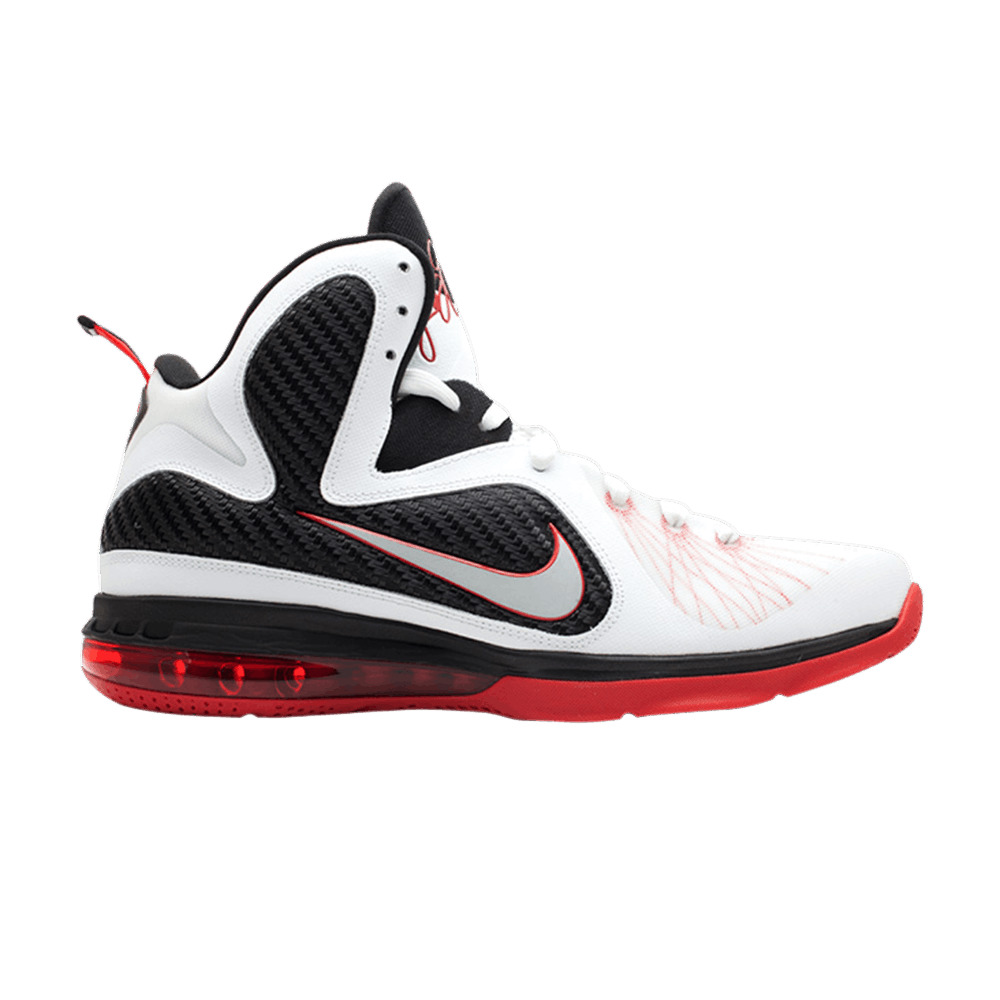 Rendered in the Miami Heat’s home uniform colors, the LeBron 9 combines Flywire and Hyperfuse technology in the upper to generate lightweight support and breathability. The shoe utilizes a Max Air 180 unit in translucent Sport Red, further supported by a Zoom unit in the forefoot and a midsole shank plate. Flex grooves are included in the outsole.