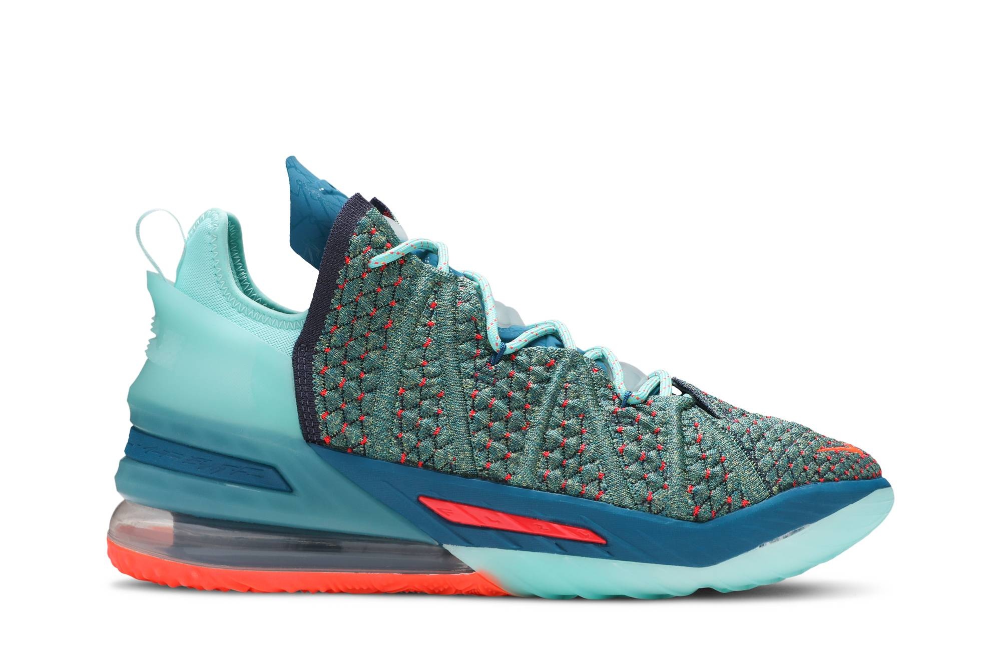 The LeBron James Family Foundation x Nike LeBron 18 ‘We Are Family’ gets its name from the tagline of LeBron’s charitable foundation, whose mission is to positively affect the children and young adults of Akron, Ohio, through educational and community initiatives. A sequel of sorts to the ‘I Promise’ edition of the LeBron 17, the sneaker features a teal-colored knit upper with contrasting orange fibers. Additional citrus accents land on the sneaker’s Swoosh branding and the back half of the rubber outsole, supporting a visible Max Air unit that houses responsive Zoom Air cushioning. ‘We Are Family’ is inscribed on one of the decorative Air pods placed atop the tongue, while the foundation’s logo is stamped on the sockliner. UPPER MATERIAL Knitposite