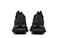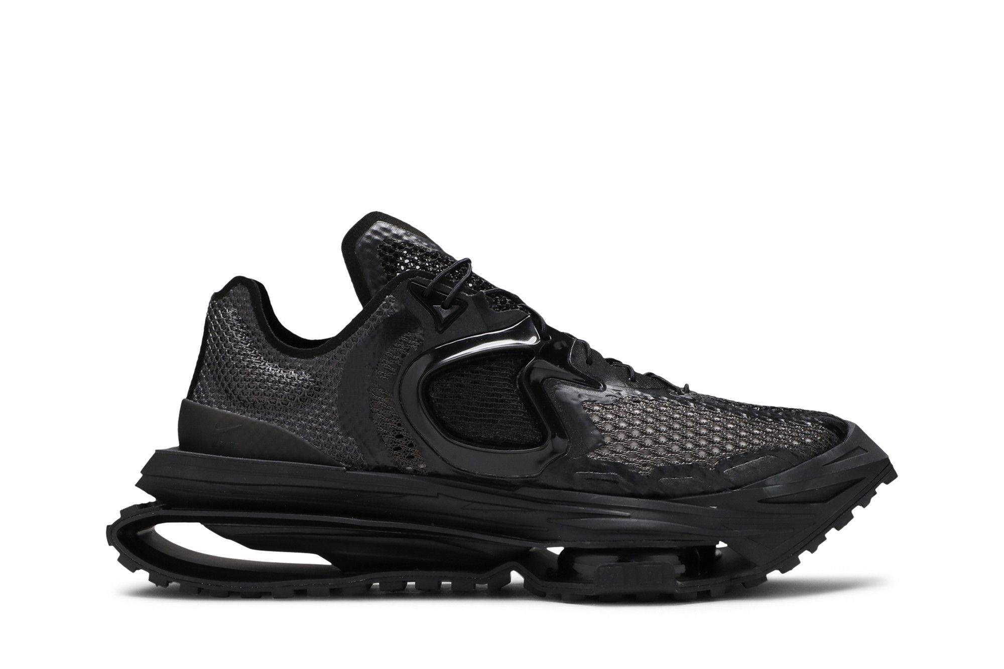 The Matthew M. Williams x Nike Zoom 004 ‘Triple Black’ reunites the Swoosh with the founder of luxury designer brand 1017 Alyx 9SM. Rendered in a monochromatic finish, the unconventional silhouette uses Nike’s history of design innovation as a starting point. The shoe combines data-backed insights with the aesthetic cues of performance running shoes from the early 2000s, resulting in tooling that utilizes mechanical cushion plates with visible Zoom Air unit in the forefoot. A caterpillar-tread rubber outsole offers maximum grip. Up top, breathable polyester mesh is fortified with tonal no-sew overlays and an external heel counter. The lateral side features glossy molded detailing inspired by molten metal. UPPER MATERIAL Mesh