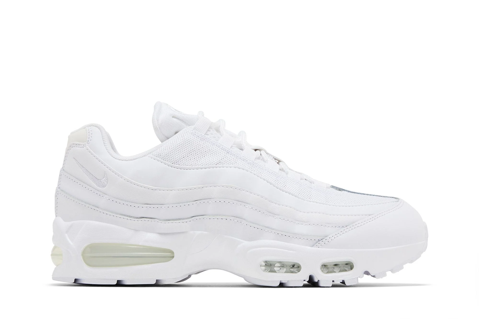 The Nike Air Max 95 OG 'White Pure Platinum' features a white leather upper built with wavy side panels and secured with rope laces that feed through webbing eyelets. Reflective detailing appears on the tongue and a molded heel panel marked with Nike Air branding. Anchoring the sneaker is a matching white polyurethane midsole with visible Air-sole cushioning in the forefoot and heel. UPPER MATERIAL Leather